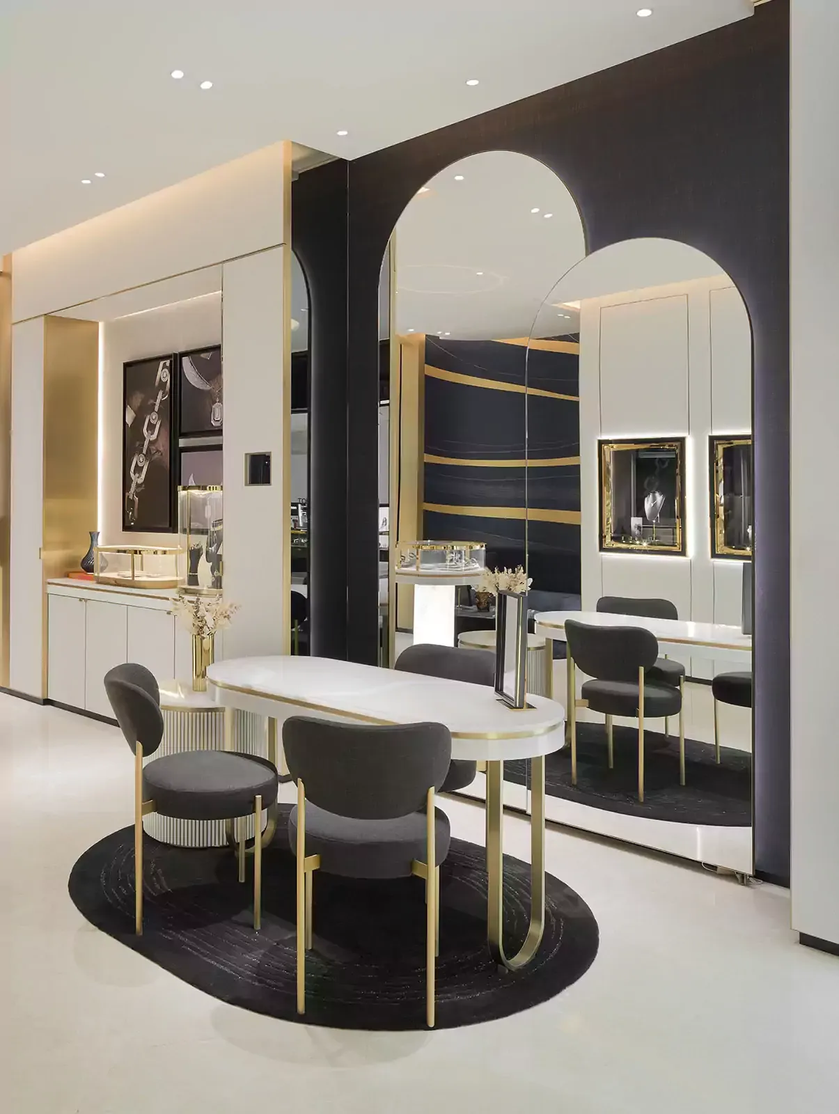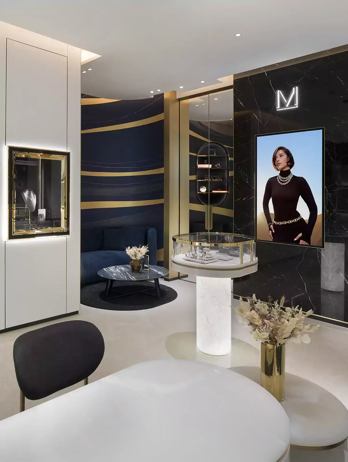 يمتد البوتيك على مساحة 60 متراً مربعاً، ويعكس في تصميمه المميز مزيج ميسيكا الفريد بين الأناقة الباريسية الكلاسيكية والطابع العصري، في تناغم يجسد روح العلامة بأسلوب راقٍ ومتجدد. ويوفّر هذا العنوان الجديد تجربة تسوق استثنائية وسط أجواء راقية، حيث تتناغم الفخامة مع التفاصيل المذهلة، من رخام ماركينا الأسود الفاخر وأسطح الأونيكس المصقولة، إلى اللمسات الذهبية الأنيقة والمقاعد الفسيحة التي تضفي طابعاً دافئاً وجذاباً. ولإضفاء لمسة من الحصرية، يضم البوتيك منطقة VIP خاصة، مصممة لعملاء الدار الأكثر تميزاً، حيث يمكنهم اكتشاف روائع المجوهرات في أجواء غاية في الخصوصية والرقي.