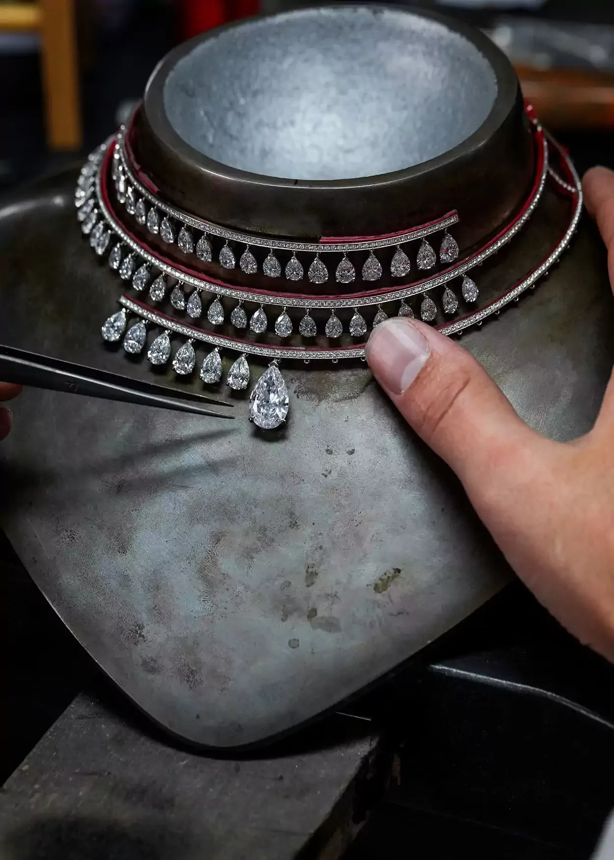 The breathtaking beauty of a high jewelry creation hints at expert craftsmanship that brings together technical, artistic and aesthetic skills. The idea first starts to take shape with an outline made in pencil. Then, after making many sketches, the designer paints the jewelry with gouache in its actual size. A striking image of realism, which serves as an essential reference for consideration by the team. This pictorial representation will have taken 30 hours work for the Diamond Whirl necklace. Then, each diamond selected for its size, purity, and quality is placed in the gold structure - springs, chatons, stones, settings, etc. - that the jeweler makes. After mounting, the piece is assembled and meticulously welded using a blowtorch, steps that determine the final shape of the piece of jewelry. The jewelry is polished both before and after setting, until it reaches the desired mirror effect. These delicate touches reveal the brilliance of the diamonds. After dozens, even hundreds of hours, setting is when the jewelry really comes to life: the setter sculpts and polishes the material, adjusting the stones so that they lay on the skin as if they were floating.
