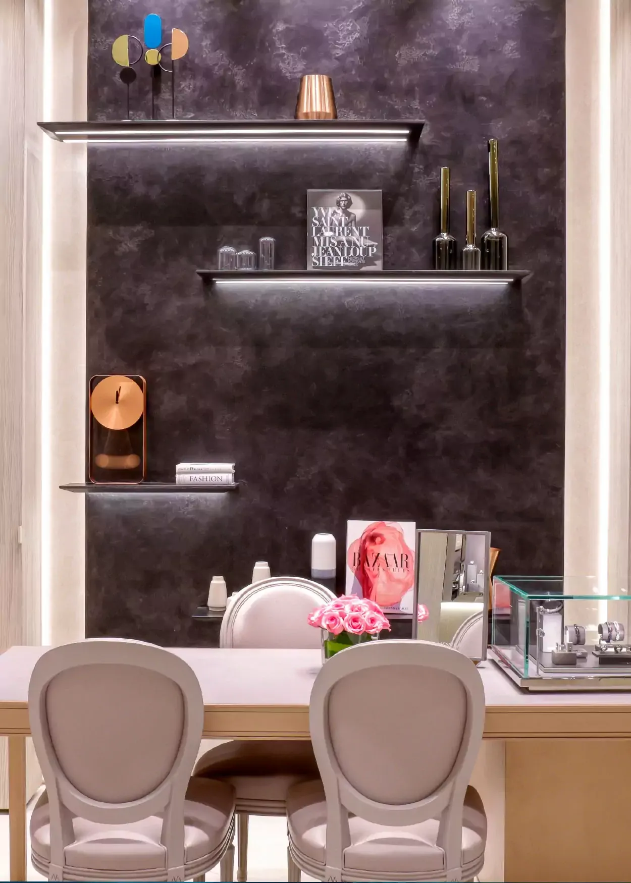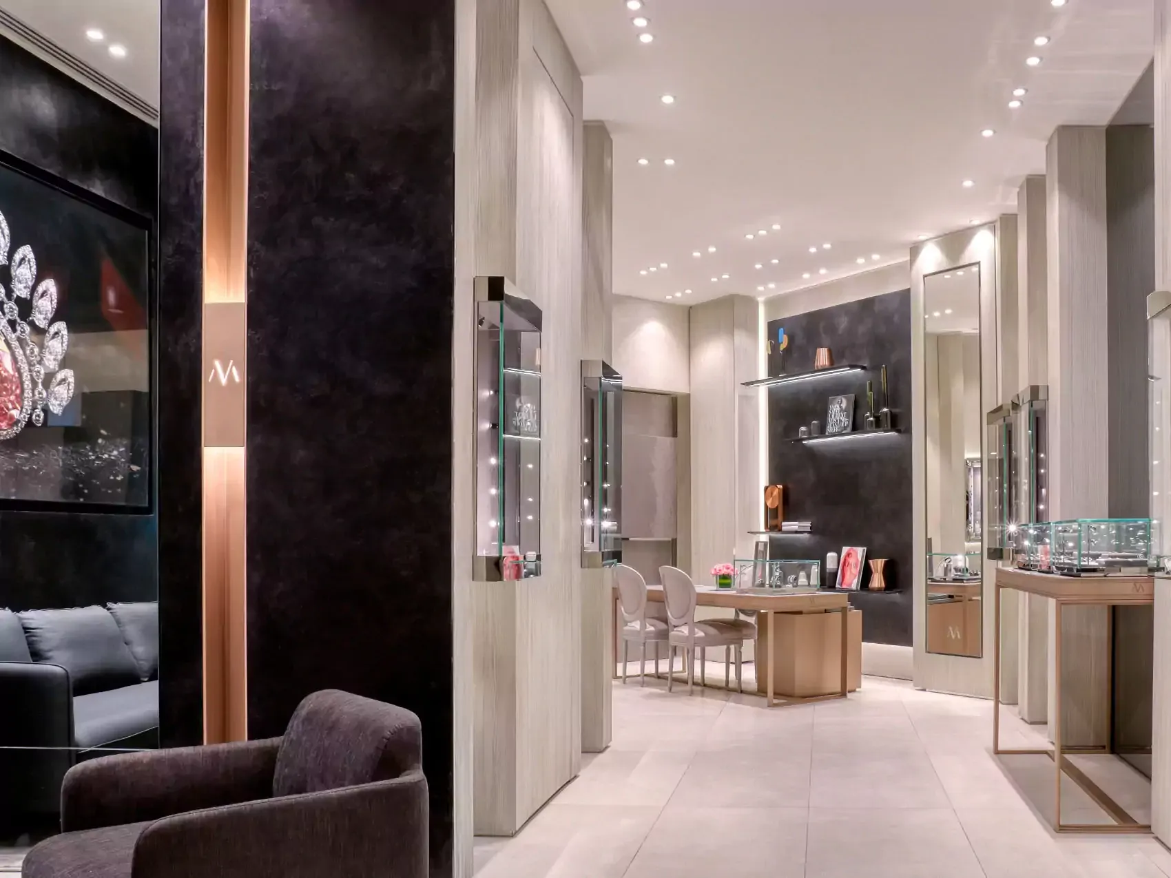 A boutique created in a magical setting that echoes the Messika’s codes. symmetry of the designs, transparency of the stained-glass, marble floor, everything is imagined to take you on an original journey around our diamond collections.