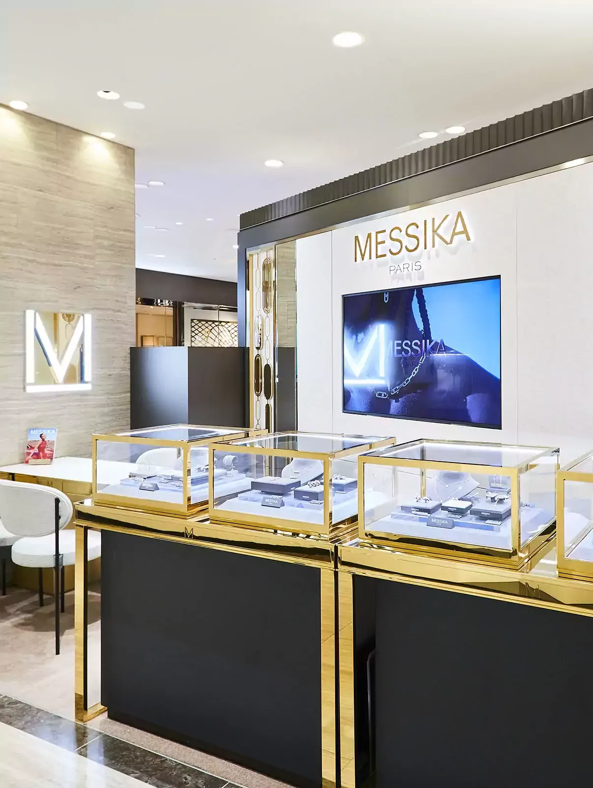 店内设计风格由品牌艺术总监Valérie Messika亲自构思,空间明亮简约,兼具尊贵与现代气息。天鹅绒与大理石营造出温馨与利落的对比效果,璀璨金光则与钻石珠宝相映成辉,令顾客立刻沉浸于Messika梅西卡的动人世界中。