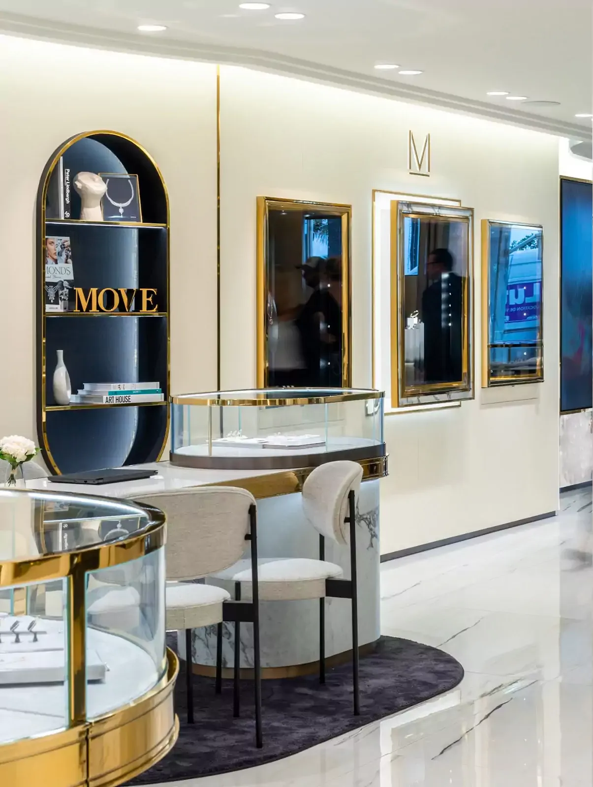 这一非凡之地处处体现创始人兼艺术总监Valérie Messika的生活艺术。设计师玩转珍贵材质与暖色调之间的鲜明对比,与白色大理石和雪花石等材质的冷色调相得益彰。白色、黑色和金色的单色设计,更加凸显出这家戛纳精品店所提供的Messika梅西卡尊贵体验。