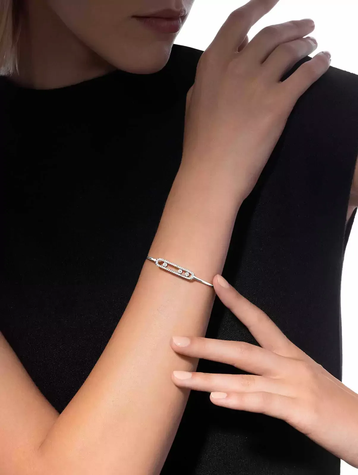 金质钻石手镯可装点您日常的每一个优雅瞬间。Messika梅西卡提供多种款式的奢华手镯。Move Romane金质钻石手镯饰有五颗活动钻石,魅力难挡,其设计大胆现代,极具震撼力。品牌的My Twin弹性手镯同样令人一见倾心,其独特的精致设计在手腕顶部开口,两侧分别镶嵌一颗梨形切割钻石和一颗祖母绿式切割钻石。为何不将这份愉悦加倍,将其与一款同样适合男性手腕佩戴的Move Pavé白金密镶钻石手镯叠戴呢?