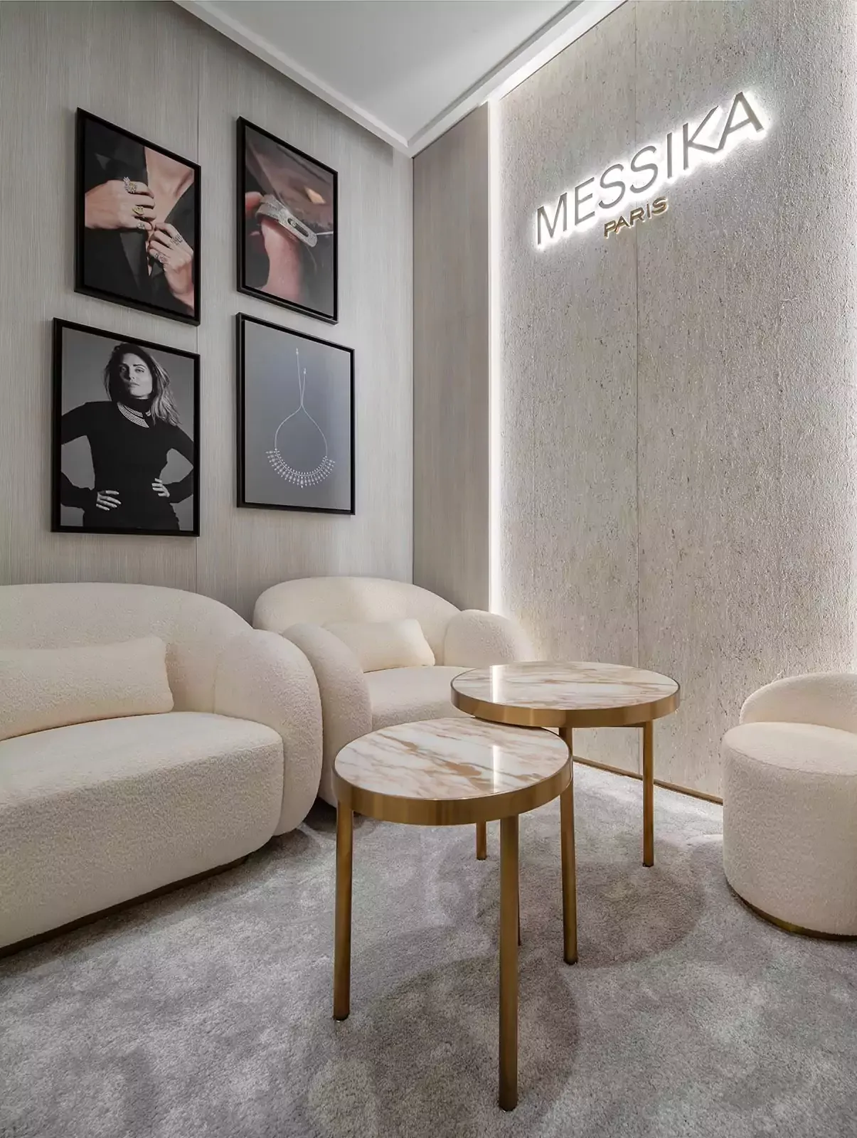 在65平方米的珍贵空间里,各处可见Messika梅西卡标志性元素。专卖店内的熠熠金光与璀璨钻石营造出奢华氛围,邀请顾客尽情欣赏Messika梅西卡珠宝杰作的迷人光芒。洋溢现代与温馨气息的建筑风格,点缀金色与黑色装饰,与黑白相间的大理石和谐搭配,带来绝佳购物体验。Valérie Messika钟爱的装饰艺术风格为整体空间注入独特美感,散发法式生活艺术气息。