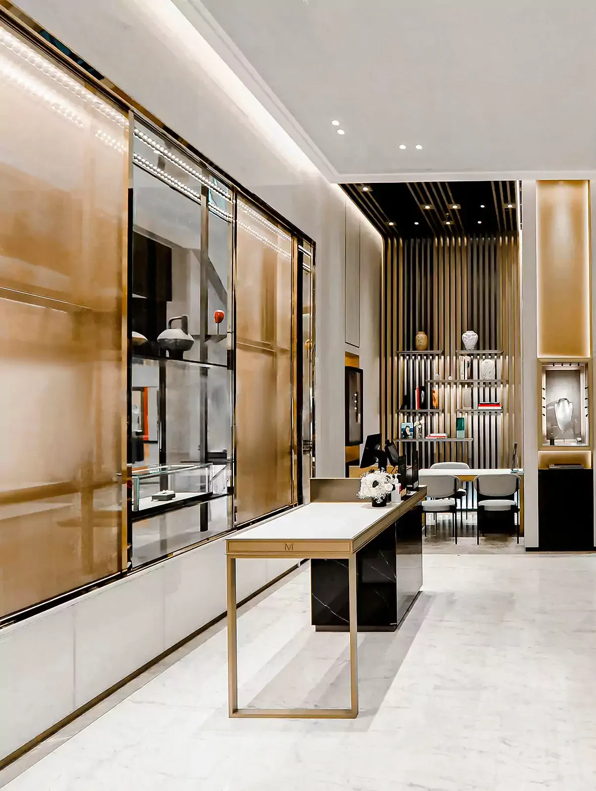 当顾客走进专卖店时,映入眼帘的黑白大理石和玫瑰金组合诠释了Messika梅西卡的美学风格——摩登、当代、优雅。对称设计、透明橱窗和每一处精致细节都令钻石珠宝的耀眼光芒尽情绽放。