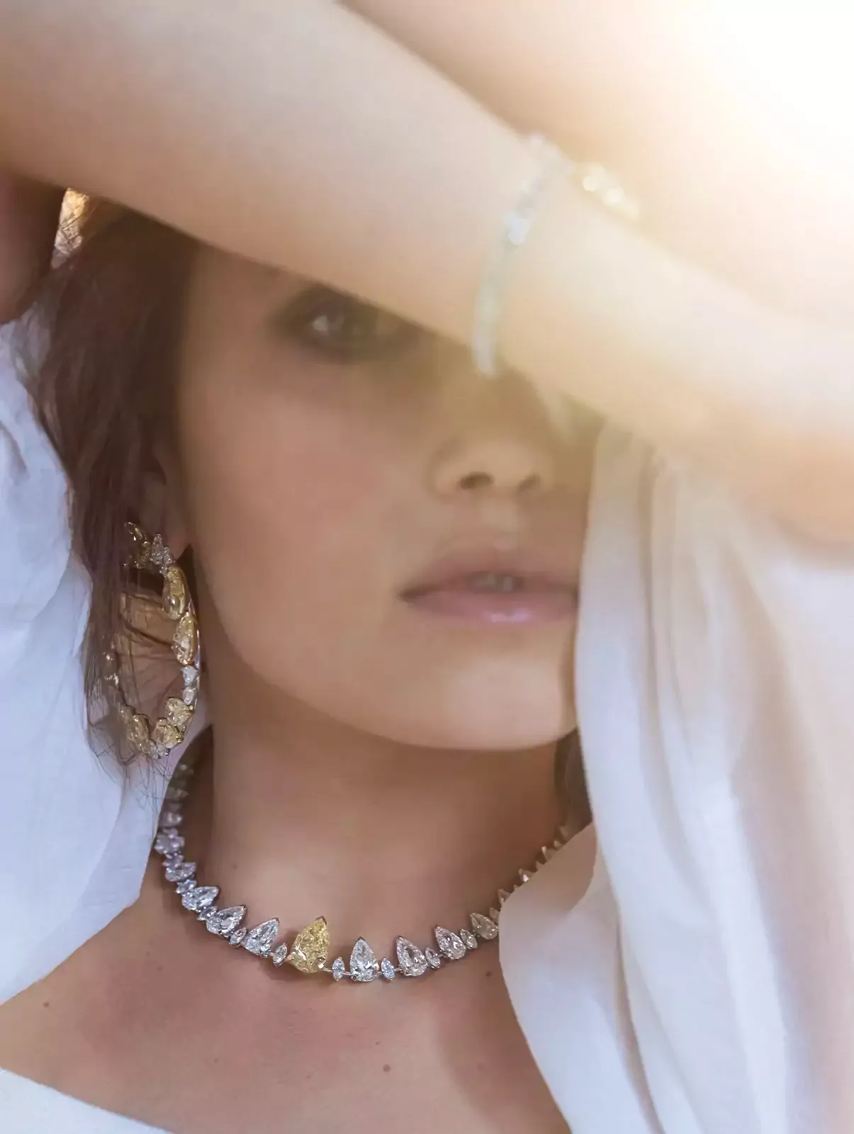 这套高级珠宝将大小不一的梨形切割钻石运用到淋漓尽致,既有熠熠生辉的白色钻石,也有散发着如阳光般灿烂光芒的黄色钻石;被称为“上帝之泪”的梨形切割钻石,化作喜悦的泪水。 宝石环簇一圈,仿佛不时变换方向,跳起圆圈舞,象征着重逢与重生。这套珠宝散发出一股不可思议、令人着迷的能量,贴颈项链和具有全新佩戴方式的耳饰相结合,展现这一源自巴黎的品牌独有的大胆风格。
