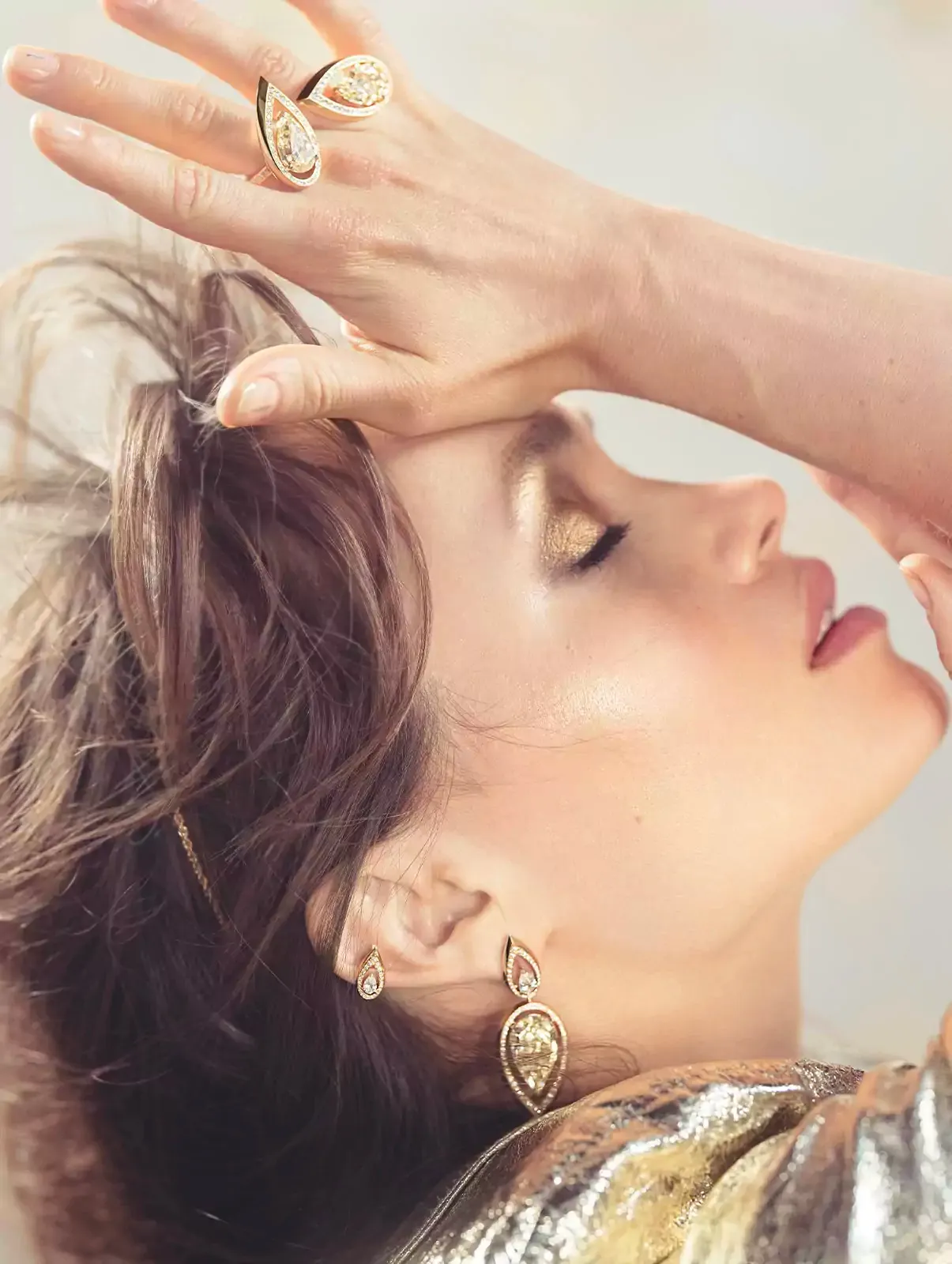 捕捉对方的气息,触碰他,欣赏他的仪表,并感受他的能量。曾经平凡无奇的一切,如今竟显得弥足珍贵。万物逐渐苏醒,光芒仿佛重获新生。现在,至关重要的是:在这场和对方关系升级的全新社交舞会里,找到自己的位置。 Messika梅西卡作品的核心元素——灵动,从未如此重要。如同重获久违的活力,再次大声宣告对生命的热爱,Messika品牌创始人,设计师Valérie Messika在这一高级珠宝系列中,赋予钻石翩然起舞的魔力,如沐阳光,绚烂多彩。她利用特大号圆圈耳环、黄色钻石、以及新颖别致的宝石搭配,创作出20件尽显奢华的珠宝作品。梨形切割钻石与金质指环经过超凡技艺的结合,达到巧妙平衡,或“背靠背”,或悬浮,仿若步态优雅的双人舞。