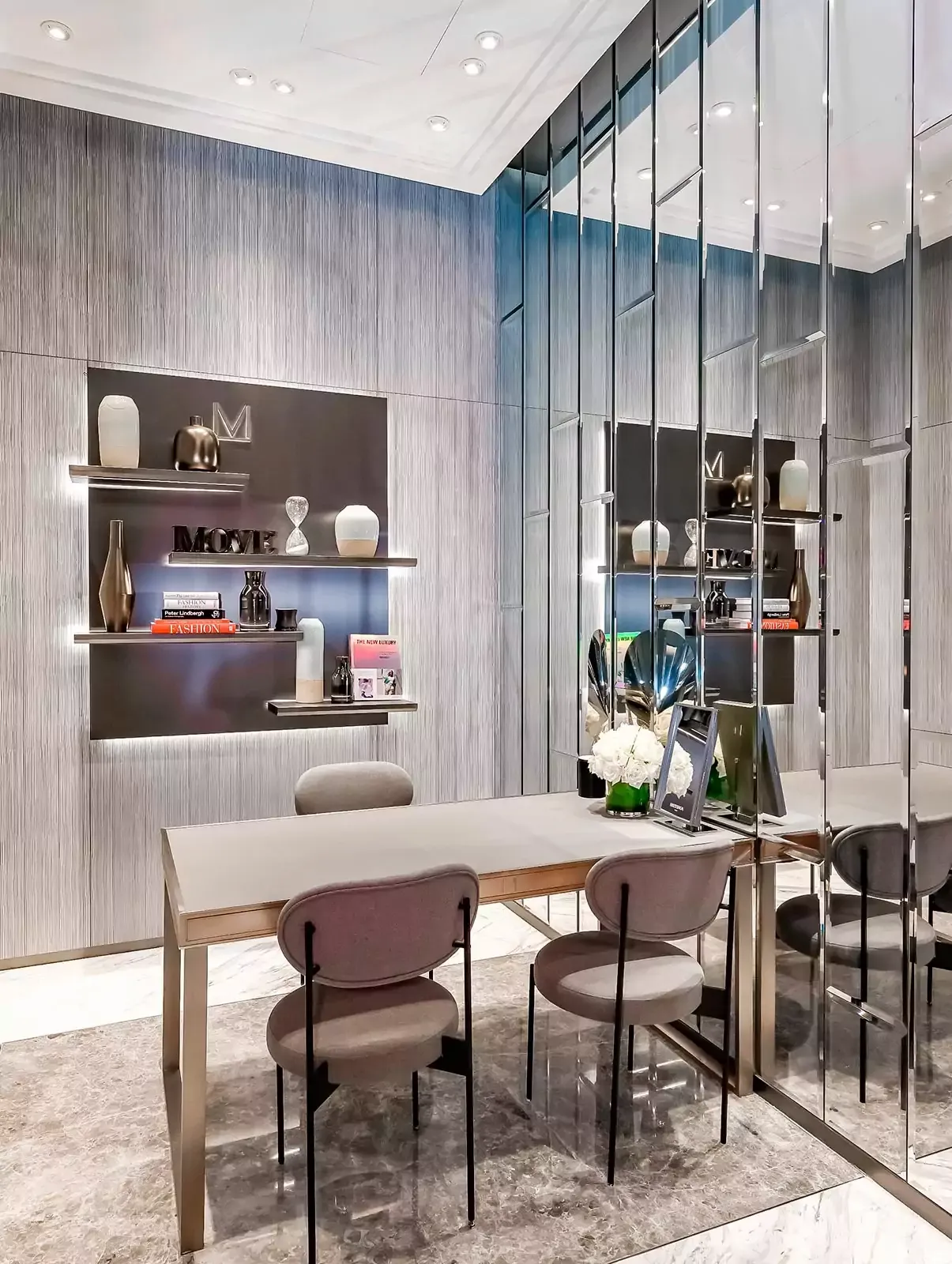 踏入精品店,顾客便完全沉浸于闪耀钻石的世界中。对称设计、透视结构、黑色大理石装饰……富有魅力的店内环境将品牌珠宝与高级珠宝系列衬托得华美动人,吸引顾客深入探索精致闪耀的珠宝作品。