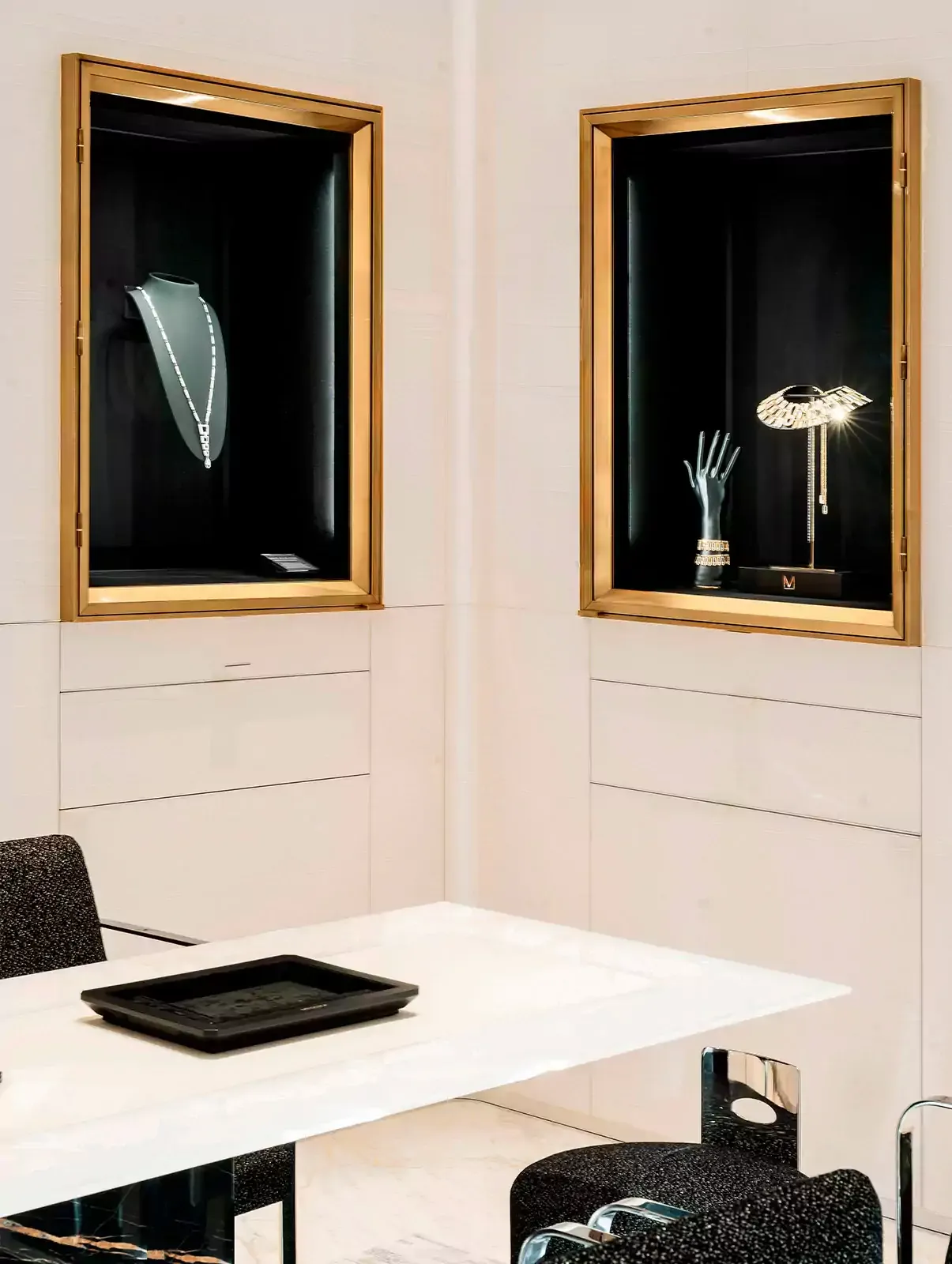 灿灿金光与精致细腻的白色大理石和缟玛瑙相映成辉,构成了奢华现代的室内装饰,一切皆与Messika梅西卡品牌形象巧妙契合。