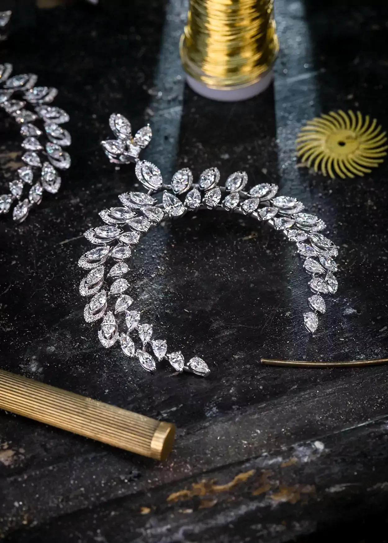 A true common thread with the Born to be Wild diamond jewels, the sensation of plumage is reinforced by the high level of technicity of the feather setting, a Maison signature. Some pear-cut and marquise-cut diamonds are enhanced by a half-surround of brilliant-cut diamonds. The stone is thereby elongated, with its perspective and volume enhanced. This jewelling technique also makes it possible to give volume to the piece since the stone in the middle is set one level above its frame.