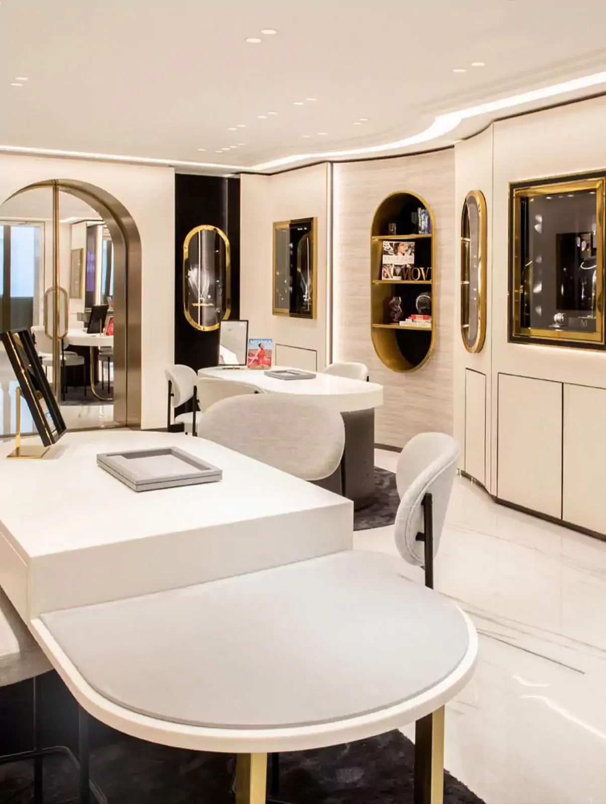 Alliant l'intemporel au contemporain, la boutique présente une palette opulente de matériaux, dont le marbre blanc et le verre transparent, agrémentés de touches d'or et de noir.