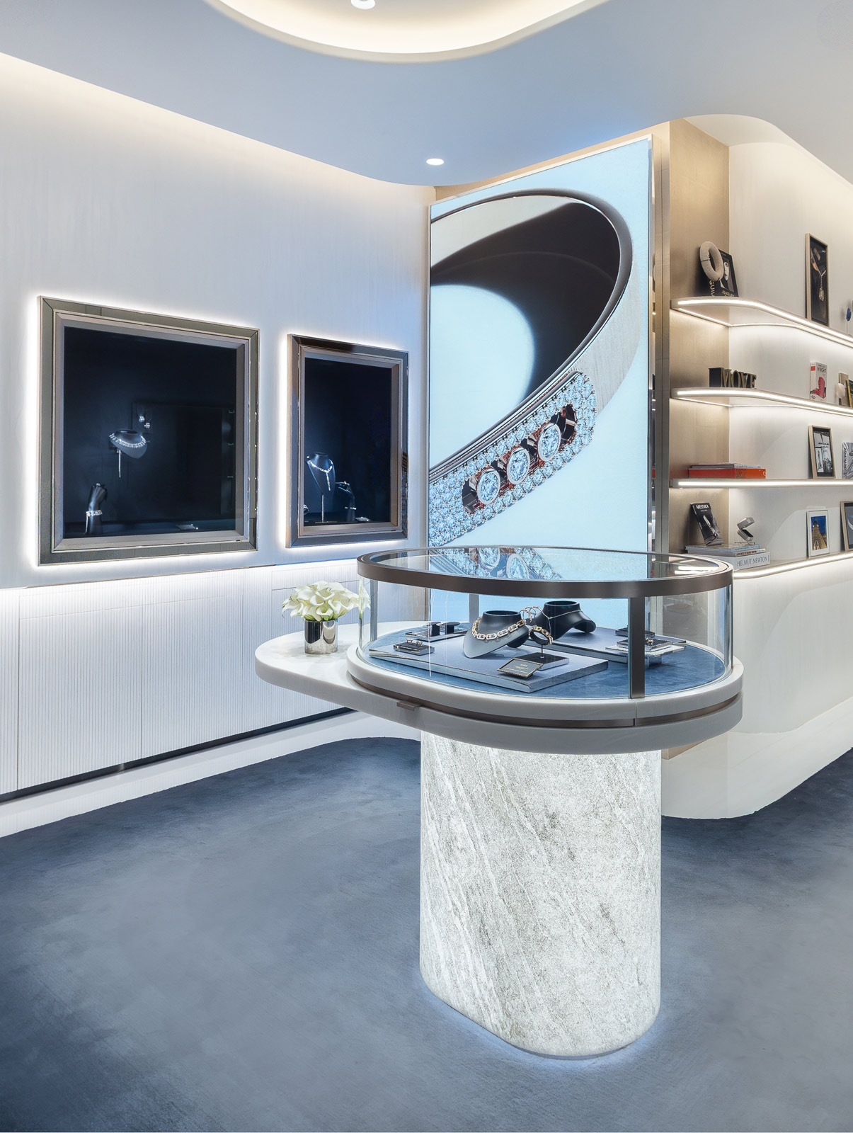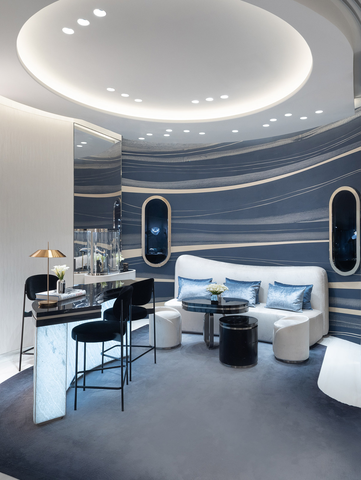 Conçue comme une résidence parisienne intime, la boutique incarne la vision artistique de Valérie Messika. Elle se révèle dans une palette de bleus ombrés, de velours noir, d’or discret et de beige doux. Alliant élégance contemporaine et raffinement cosmopolite de la Café Society — une époque incarnant un nouvel art de vivre — l’espace rayonne de vitalité culturelle et de sophistication moderne.