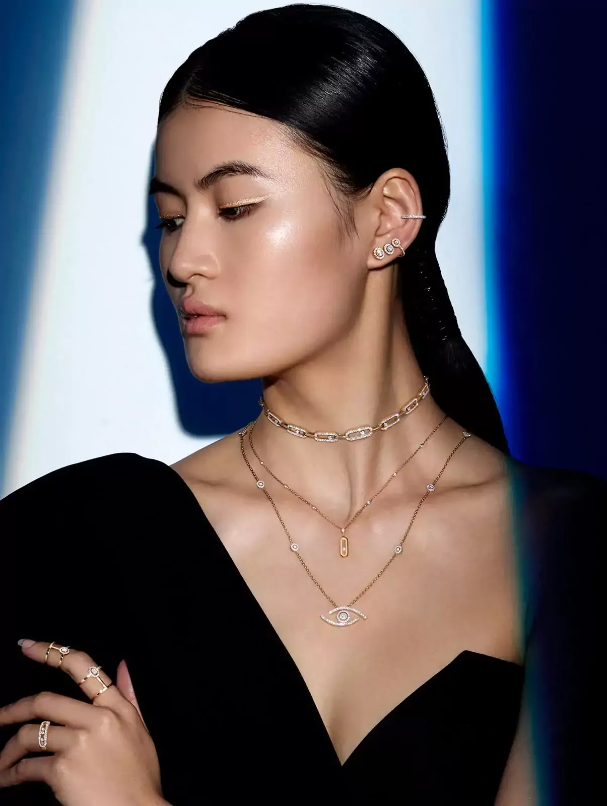 L’accumulation de colliers or et diamant à votre cou, ne doit pas être prise à la légère : la superposition des bijoux, devenue hyper tendance parvient à donner davantage de relief et de caractère à un look, jusqu’à le transcender. Brouillez les pistes. Conjuguez les formes et les motifs, brisez avec malice la symétrie et multipliez les longueurs et les styles de bijoux : rien n’est interdit, c’est vous seule qui fixez les limites, en affirmant ainsi votre personnalité ! Une seule règle à respecter : Osez et amusez-vous ! En portant par exemple, un collier diamant Messika ras du cou avec un collier doté d’un système coulissant vous permettant de l’ajuster à la longueur souhaitée, puis terminez le tout avec un sautoir ! Le stacking sera par ailleurs un excellent moyen de raviver l’éclat de votre teint, le rendant encore plus lumineux, en particulier grâce au mélange des différentes couleurs portés en accumulation.