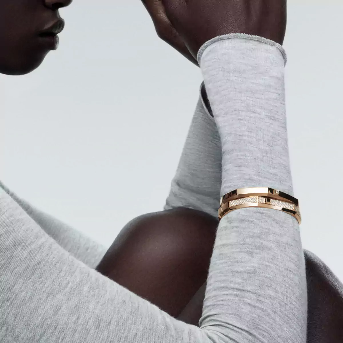 Valérie Messika transpose cette rigueur formelle dans la matière, transformant ce métal solaire en une œuvre sculptée, facettée comme un diamant.