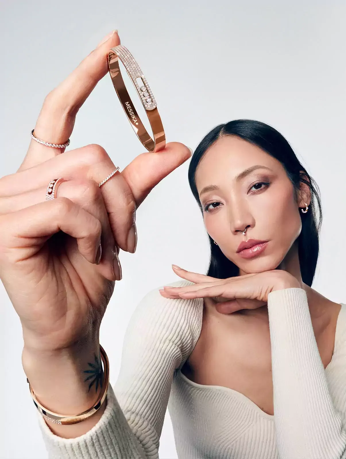 Die amerikanische Sängerin und Model Park Soo Joo zeigt sich in vielen Facetten. Als sie während ihres Grafikdesignstudiums von einer Modelagentur entdeckt wurde, gab sie den Anstoß zu einem Schritt, der den starken Wendepunkt in ihrem Leben markierte. Die „Freundin der Maison“ ist nicht nur eine angesehene Modefigur, sondern auch eine leidenschaftliche Musikliebhaberin. Ein Leben voller Bewegung und Rhythmus, das auf natürliche Weise mit der Move Noa Schmuckkollektion in Resonanz steht. Drei bewegliche und tanzende Steine, die drei Akzente des Lebens enthüllen.