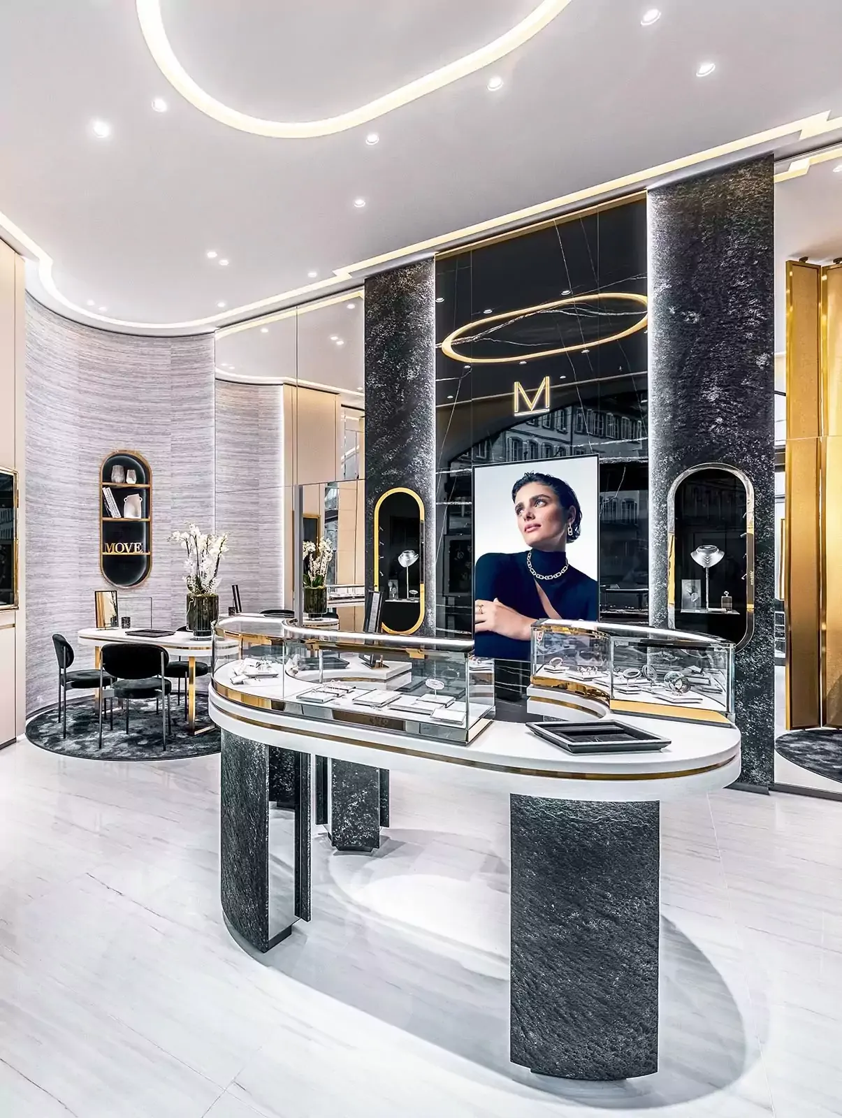 Schwarzer Marmor, Gold-, Grau- und Beigetöne, ein eleganter und gemütlicher Salon – alle Codes der Maison sind in diesem kostbaren, über 50 m2 großen Lokal zu finden. Eine luxuriöse Pause zwischen Gold und Diamanten, um den Glanz der Diamantschmuckstücke zu genießen. Das Einkaufserlebnis erreicht seinen Höhepunkt im VIP-Bereich in einer Nische in sanften Blautönen, die dank ihrer drehbaren Paneele einen perfekten Kokon der Intimität bietet. Die Boutique ist ein exklusives Schmuckstück, das die von Valérie Messika so geschätzte französische Lebenskunst perfekt verkörpert.