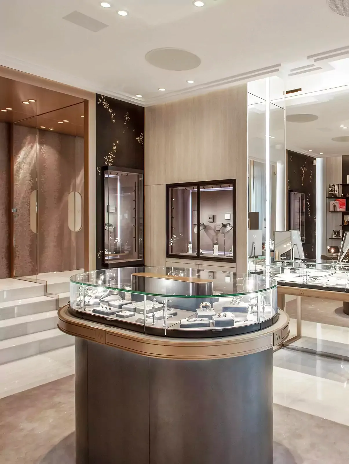 Direkt nach dem Betreten der Boutique taucht der Kunde in das Markenuniversum ein. Mit symmetrischem Design, transparenten Vitrinen, Marmorboden und schwarzen Details schafft Valérie Messika eine zauberhafte Atmosphäre für ihre Schmuckkollektionen aus Diamanten.