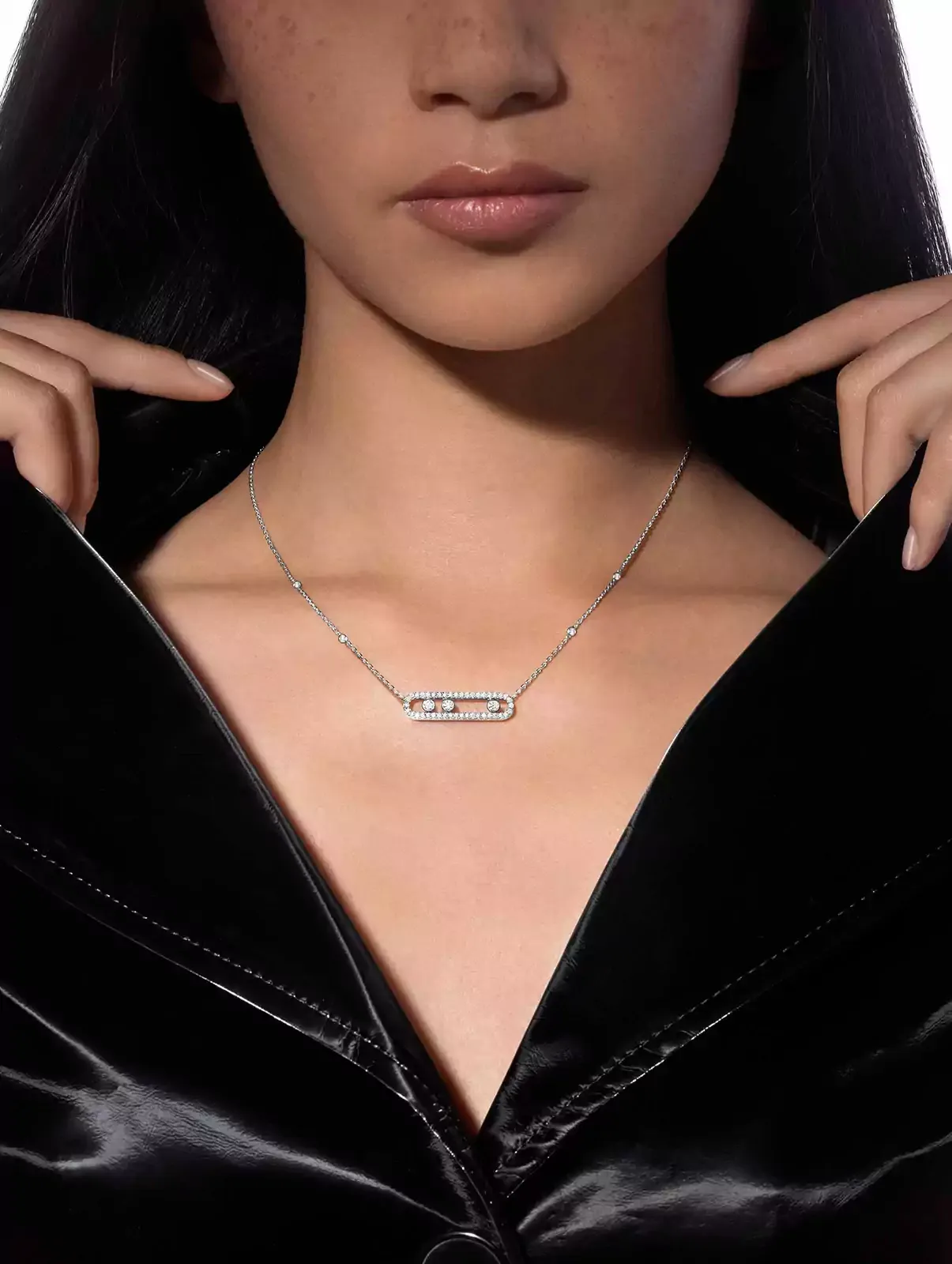 Durch das Übereinanderlegen von Diamantketten können Sie Kontraste ausloten, um einen modernen und selbstbewussten Look zu kreieren. Schmücken Sie sich mit einer Signature Move Uno Halskette aus Weißgold. Das hypnotische Diamantschmuckstück mit dünner Goldkette verfügt über den kostbaren Move Käfig, der mit einem Diamanten im Clos-Coulisse-Stil verziert ist und mit jeder Bewegung schillert. Für einen auffälligeren Look kombinieren Sie die Kette mit einer zweiten Move Classique Diamantkette, die mit ihren 5 Verschlussringen verstellbar ist. Eine luxuriöse Halskette mit hypermodernem Design, deren drei bewegliche Diamanten sie zu einem Gold- und Diamantschmuckstück mit Herz machen.
