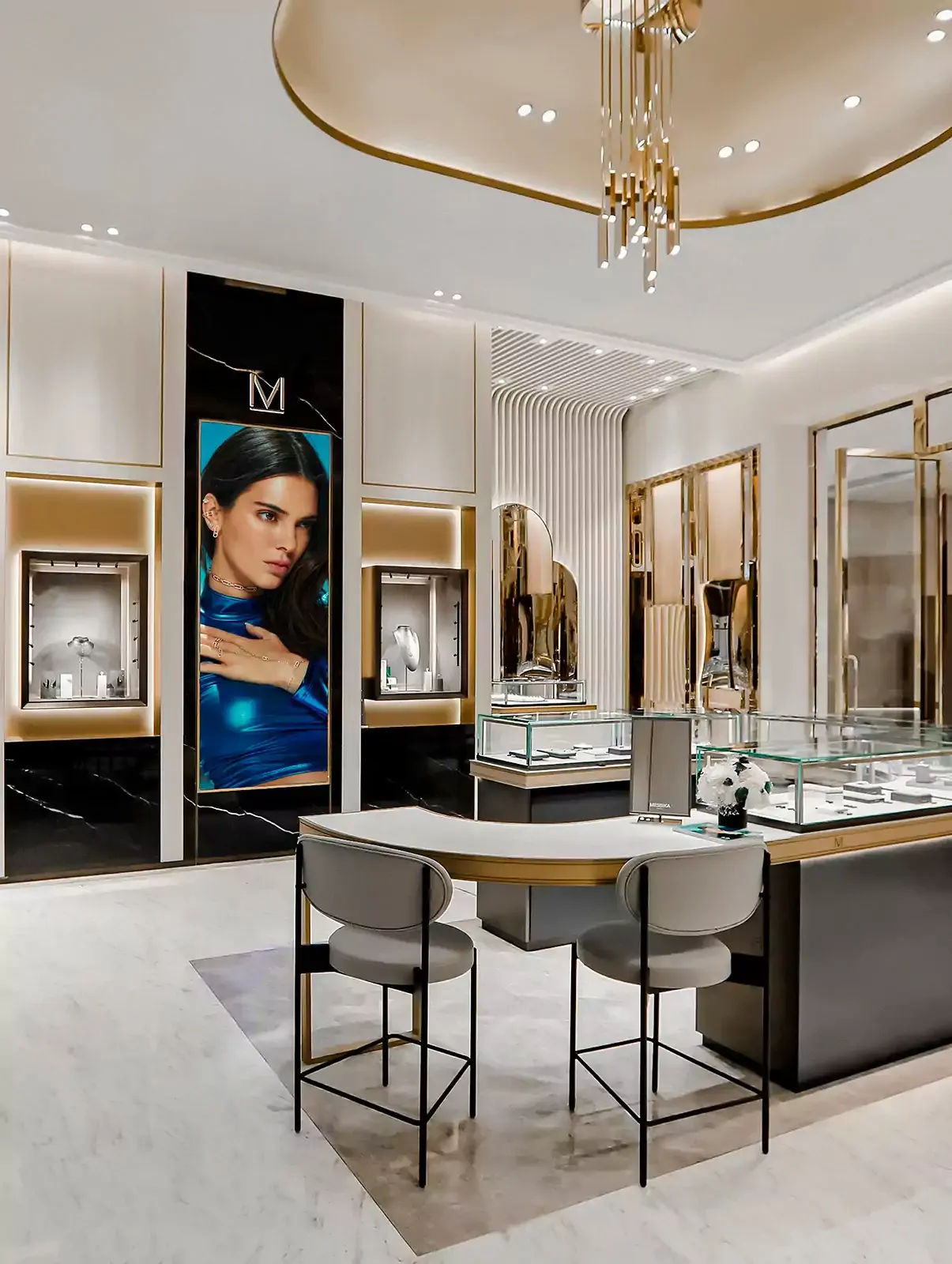 Im Inneren der Boutique verkörpert die Kombination aus schwarz-weißem Marmor und Roségold den ästhetischen Stil von Messika – modern, zeitgemäß und elegant. Symmetrische Designs, transparente Fenster und jedes exquisite Detail bringen das schillernde Licht des Diamantschmucks maximal zur Geltung.