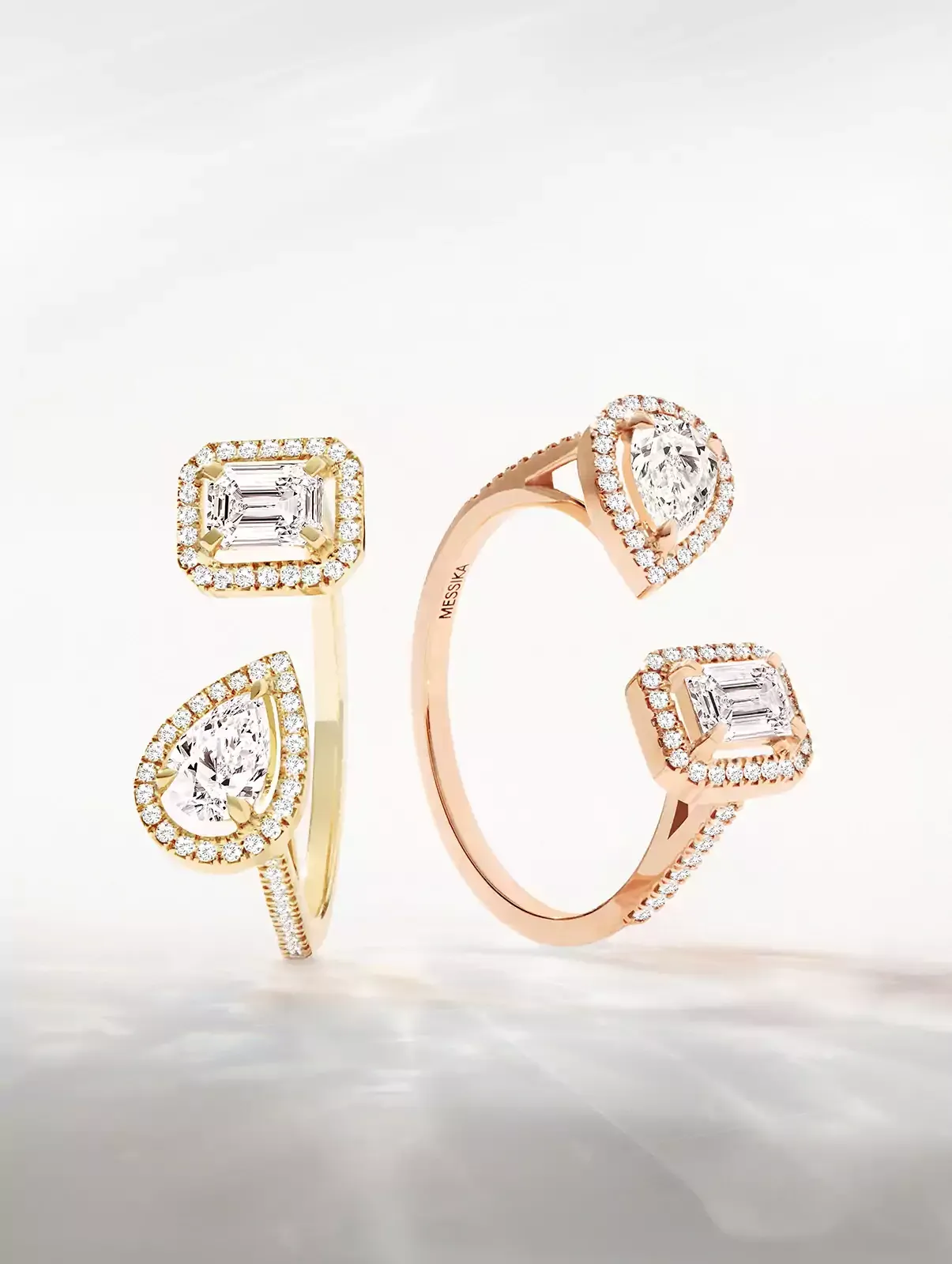 Eine Kollektion, die sich durch ihre Eleganz auszeichnet und mit charaktervollen Kontrasten spielt: das Zusammentreffen von Oval und Smaragd für ein Duo außergewöhnlicher Diamanten, das für immer miteinander verbunden sein wird. Ein perfektes Gleichgewicht von Formen, die sich anziehen und Gegensätze bilden, für einen Hauch von Originalität und zeitloser Raffinesse.