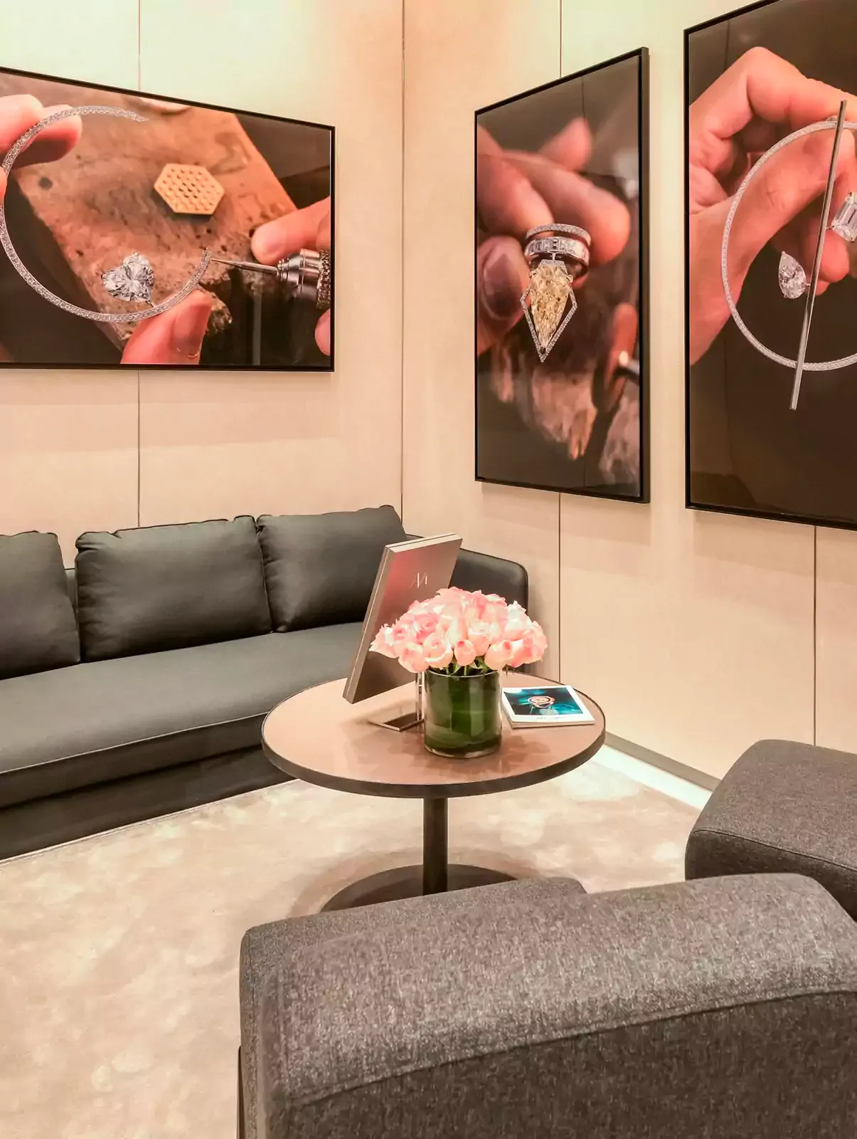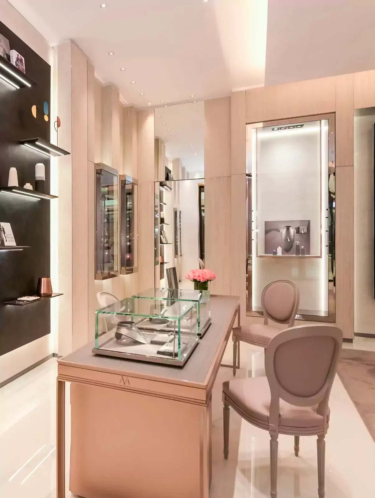 Die im Erdgeschoss gelegene prachtvolle Boutique befindet sich Seite an Seite mit anderen hochwertigen Luxusmarken. Die Boutique übernimmt auf 90 Quadratmetern mit fantastischen Grautönen die Codes der Maison Messika.
