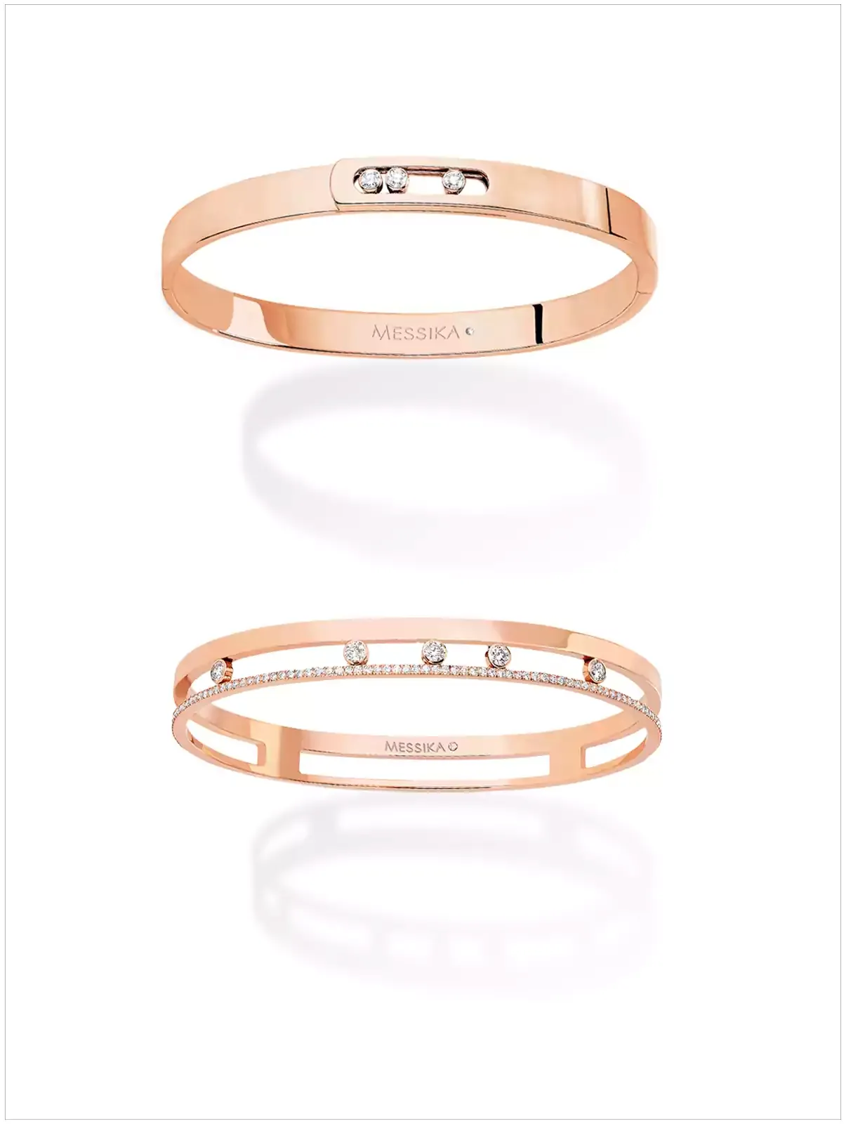 Valérie Messika gewährt uns mit den Kollektionen Move Romane & Move Noa einen Einblick in ihre Intimität. Eine leidenschaftliche Liebeserklärung in Anlehnung an die Vornamen ihrer beiden Töchter. Unter den Schmuckstücken dieser beiden Kollektionen, die der kühnen Designerin so sehr am Herzen liegen und ihre Geschichte prägen, schillern vor allem die kostbaren Diamantarmreifen aus Gold stets an ihren Handgelenken. Der Move Romane Armreif ist in erster Linie ein bewundernswertes architektonisches Schmuckstück mit starkem Charakter, der von fünf beweglichen, schillernden Diamanten betont wird. Der Move Noa Armreif wiederum zeichnet sich – mit Diamanten ausgefasst oder nicht – durch ein äußerst schlichtes Design und drei bewegliche Diamanten als Zeichen ewiger Liebe aus. Zwei prachtvolle Schmuckstücke, die Valérie Messika als Anhäufung und Mix & Match in Kombination mit weiteren Schmuckstücken persönlich zur Schau trägt.