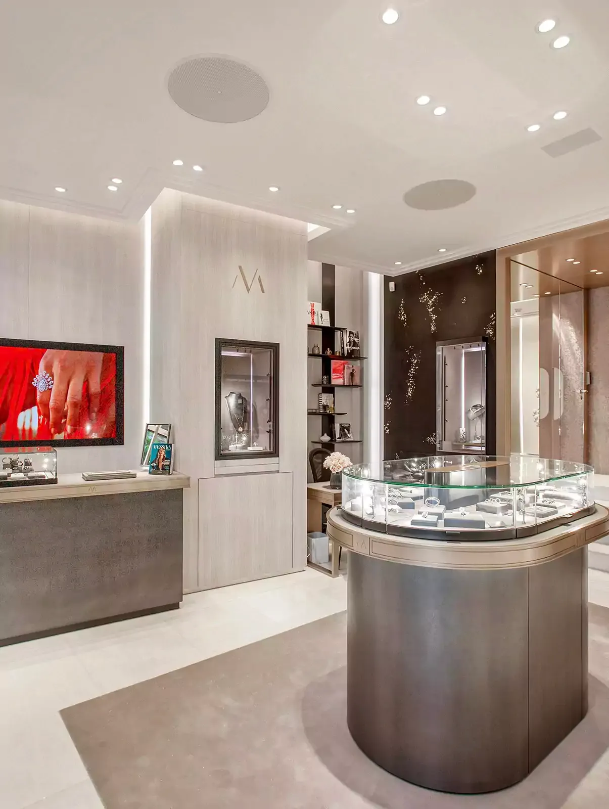 Tan pronto como entran en ella, los clientes se sumergen en el universo de la marca. Diseño simétrico, escaparates con transparencias, suelo de mármol y detalles de color negro: Valérie Messika ha creado un ambiente mágico para sus colecciones de joyería de diamantes.