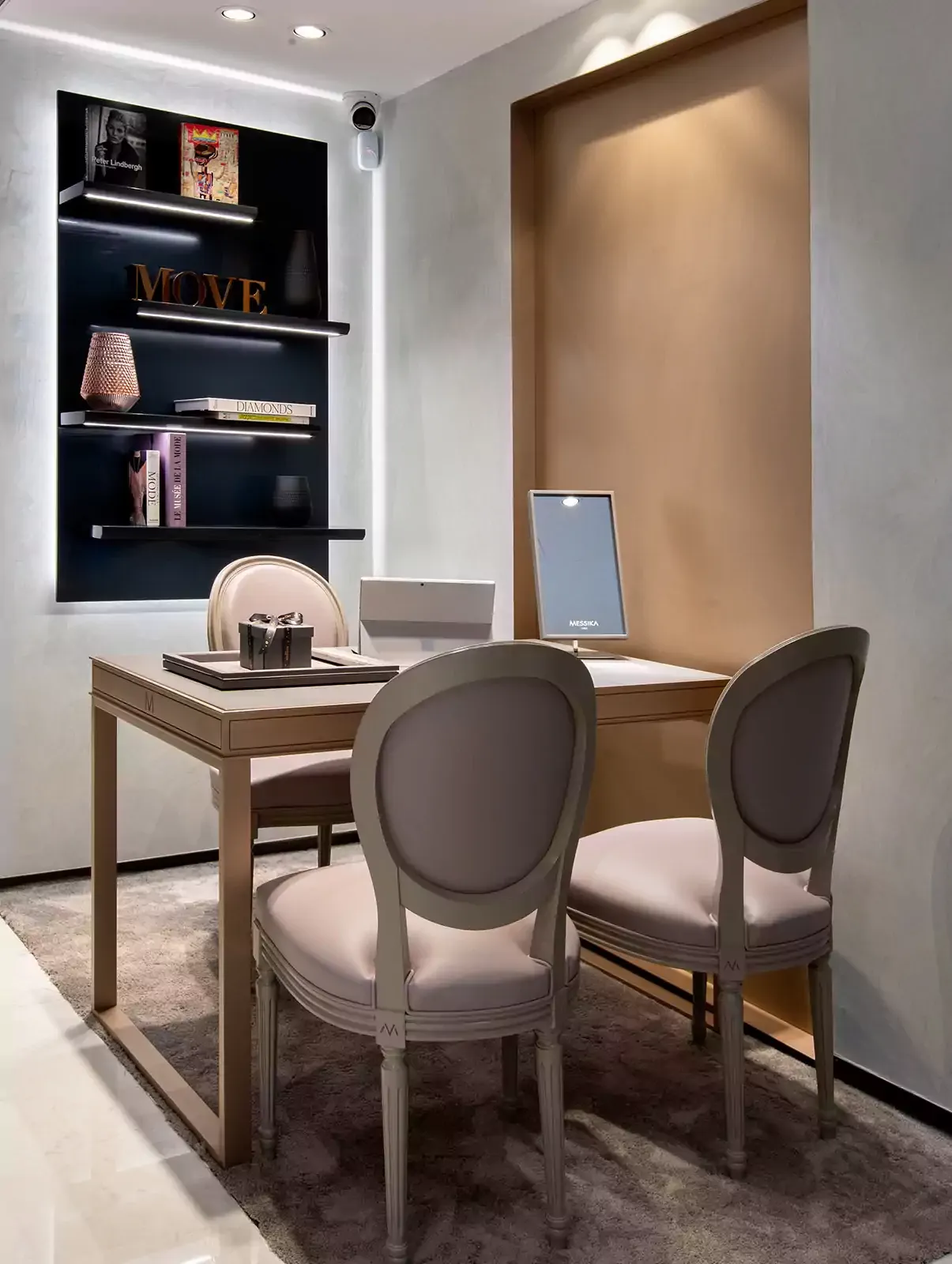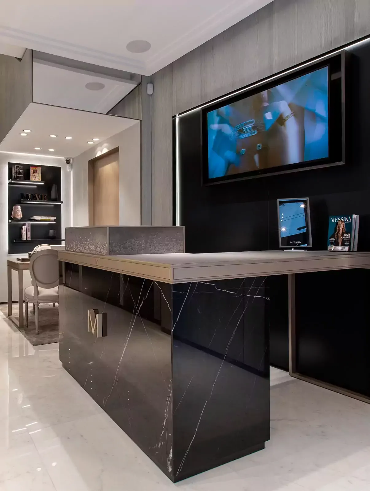 Tan pronto como entran en ella, los clientes se sumergen en el universo de la marca: diseño simétrico, escaparates con transparencias, mármol negro para destacar el brillo de los diamantes… La creadora ha ideado un espacio mágico para realzar sus colecciones de joyería y Alta Joyería.