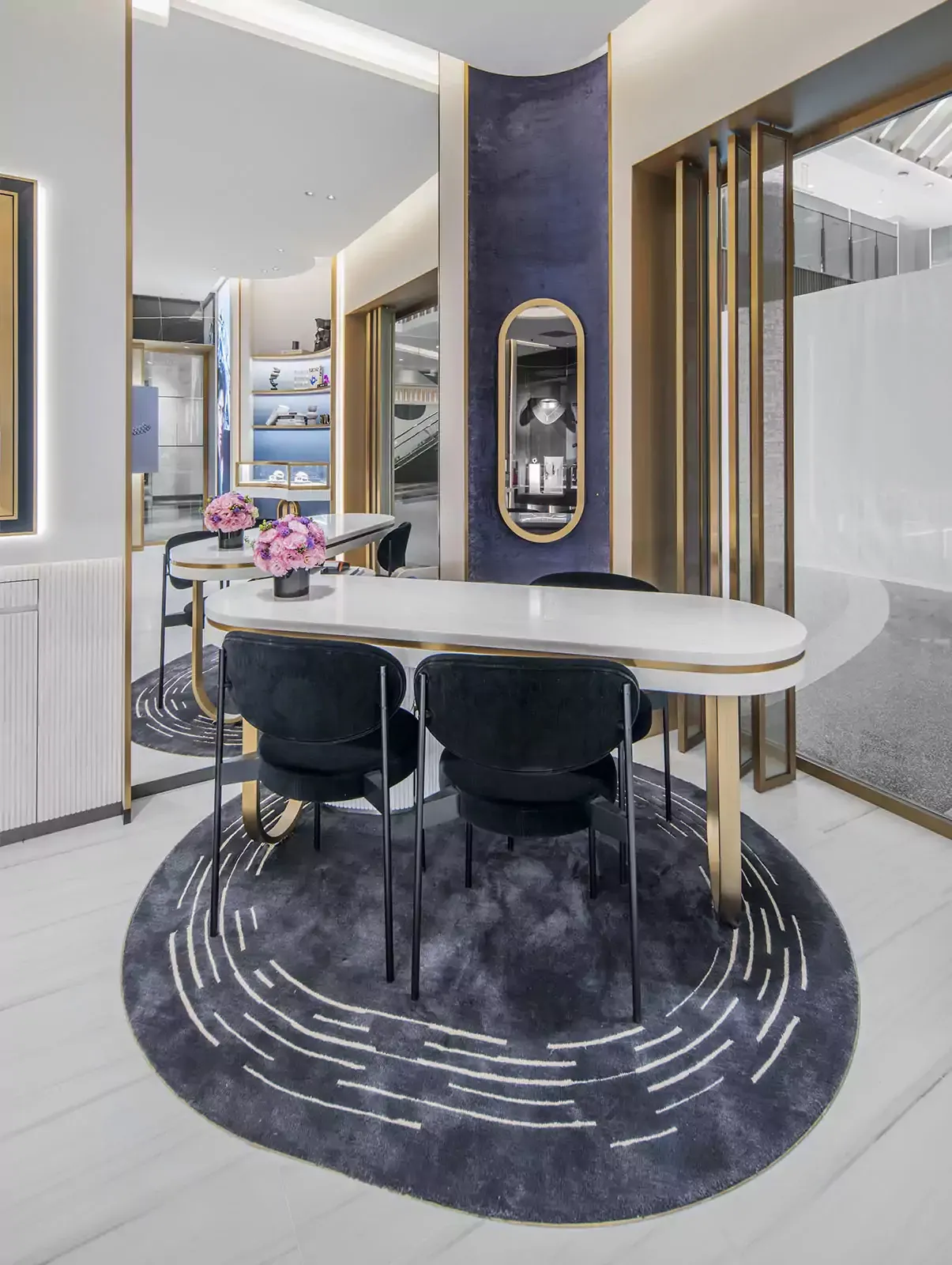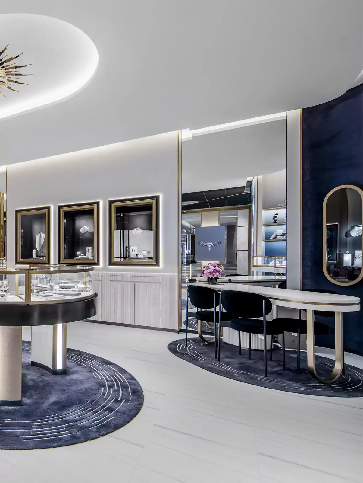 Este nuevo establecimiento diseñado por Valérie Messika combina elegancia y modernidad. Los colores negro, dorado y blanco se mezclan para representar a la perfección el ADN de la Maison. El diseño curvo evoca la icónica colección Move. El uso de espejos, vidrio y mármol acentúa el brillo de las joyas de diamantes, sumergiendo al instante a los clientes en el universo de la Maison y de los diamantes.