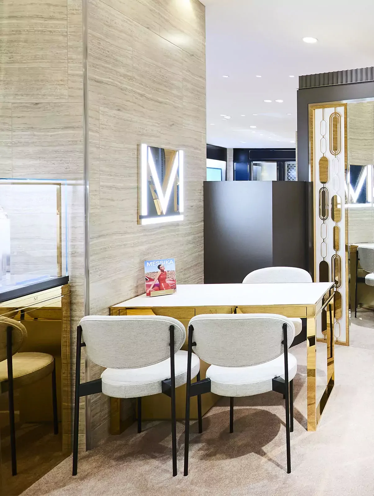 El interior de la boutique, diseñado por la directora artística Valérie Messika, es un espacio luminoso y sencillo que combina prestigio y modernidad. El terciopelo y el mármol crean un contraste entre la calidez y la frescura, mientras que los tonos dorados acentúan el brillo de las joyas de diamantes, transportando inmediatamente a los clientes al universo de la Maison Messika.