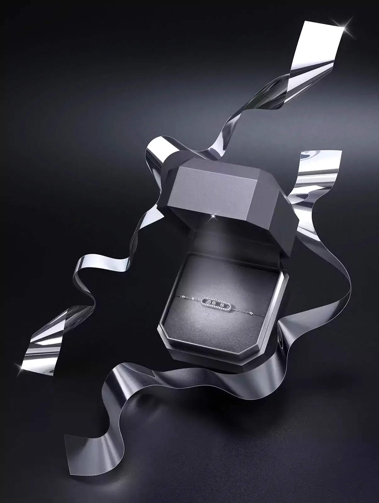 Asimismo, el estuche forma parte de la magia de regalar y recibir, y en Messika le prestamos especial atención. Bajo el cielo estrellado, de noche en el desierto, cerca de un lago, después de un paseo parisino o a la luz de la luna... Son numerosas las peticiones de matrimonio o declaraciones de amor repletas de magia y magnificadas por el luminoso estuche diseñado por Valérie Messika.