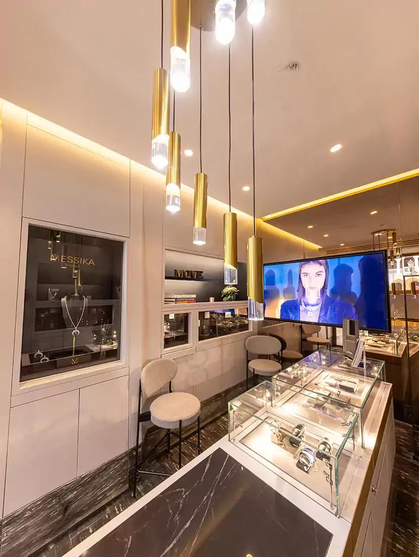 Este nuevo escaparate sumerge al visitante en el universo de la Maison. Este enclave único y luminoso combina oro y mármol para resaltar todo el brillo de las joyas de diamantes. Una combinación de lujo y modernidad diseñada por Valérie Messika que provoca una intensa emoción desde la primera impresión.