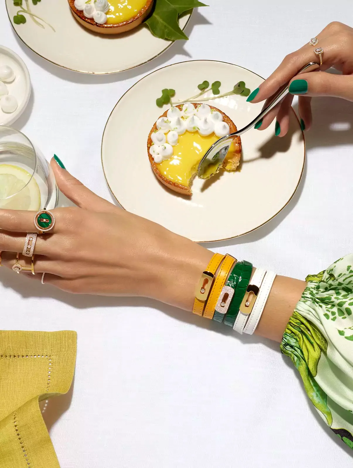 Con o sin pavé de diamante, las pulseras My Move de piel rojo cereza y naranja mandarina son un auténtico accesorio de moda revitalizante y lleno de energía. La posibilidad de intercambiar la pulsera de piel y el motivo Move de oro o de titanio ofrece múltiples interpretaciones para una joya de lujo divertida y personalizada. ¡Un auténtico juego de niños!