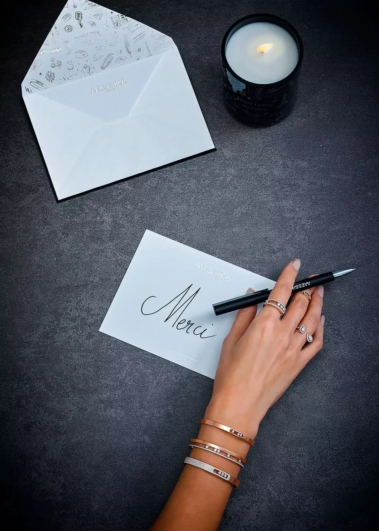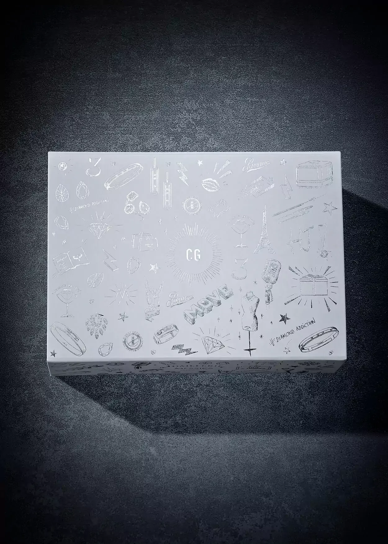 A ce titre, Messika vous propose de vivre une expérience unique. Pour toute commande passée en ligne sur notre site officiel, chaque client peut ainsi se voir offrir un coffret qui conjugue de manière éclatante luxe, tradition et modernité. Un coffret hors normes, baigné dans l'univers puissant de la Maison Messika, sur lequel vous pouvez y faire inscrire les initiales de votre choix, en lettres argentées. Une véritable œuvre singulière aussi, façon street art, où s'y reflètent les codes avant-gardistes et novateurs du joaillier parisien.