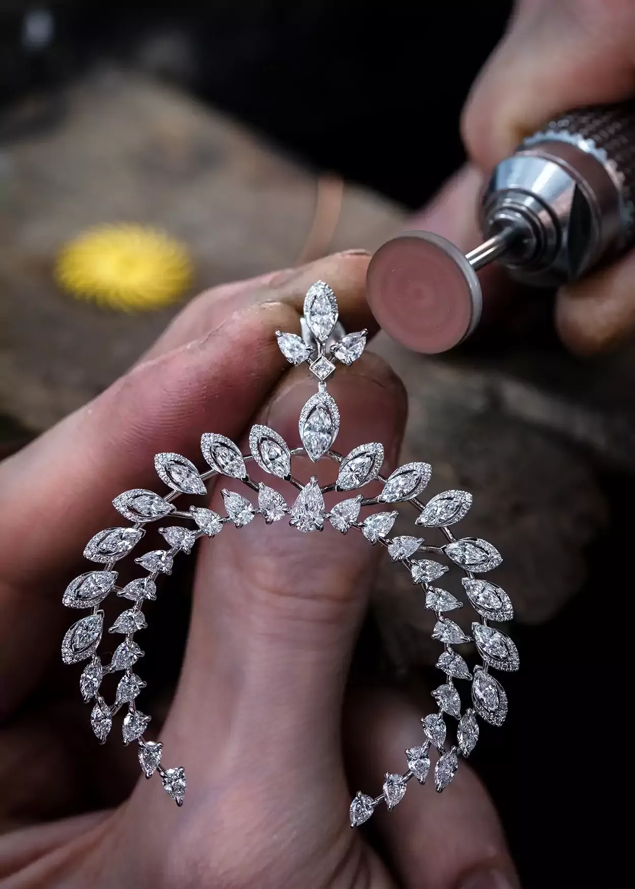 Véritable fil conducteur des parures Born to be Wild, la sensation de plumage est renforcée par la technicité du serti plume, signature de la Maison. Certains diamants tailles poire et marquise sont soulignés par un travail de demi-entourage de diamants taille brillant. La pierre est ainsi prolongée, la perspective et le volume renforcés. Cette technique d’empierrage permet également de donner du volume à la pièce puisque la pierre de centre est sertie un niveau au-dessus de son entourage.