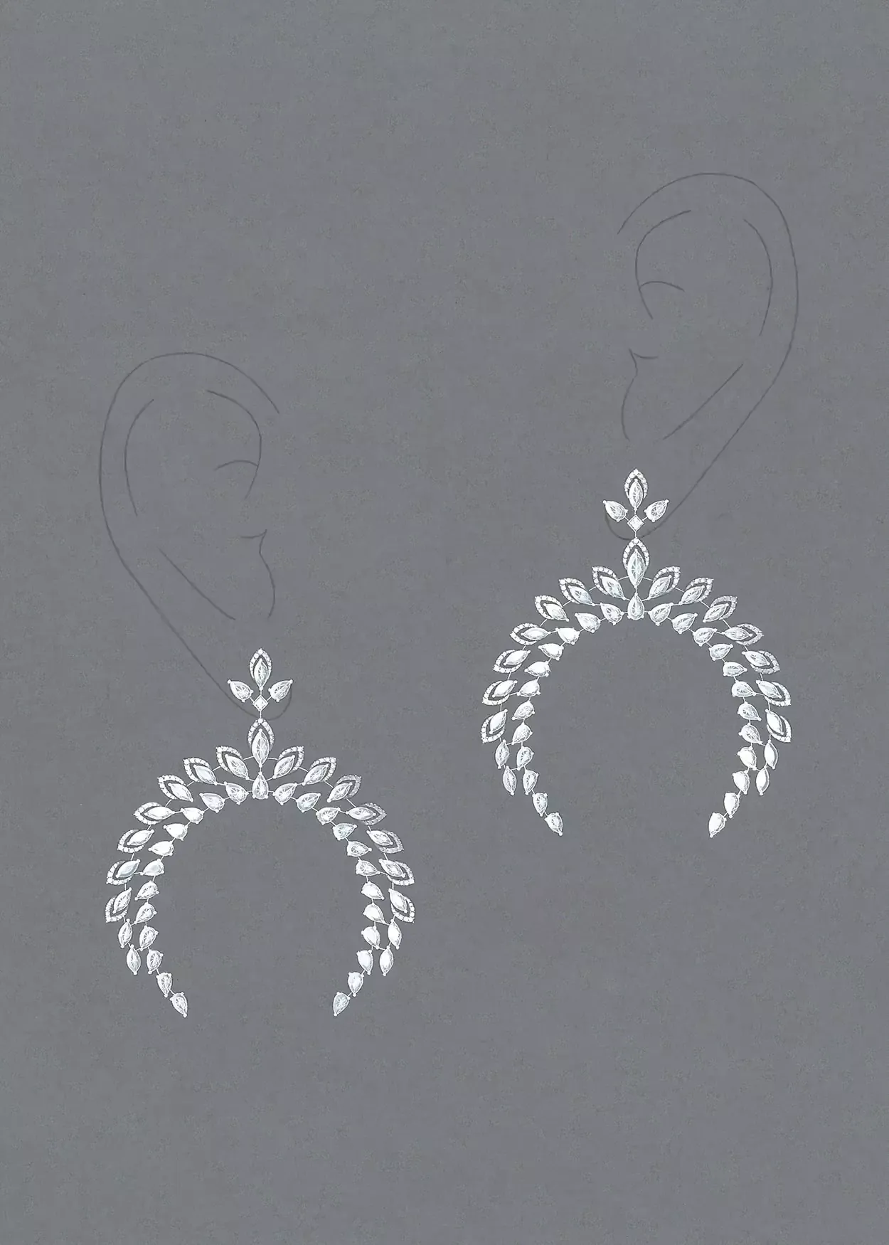 Dans un esprit bohème chic, la créatrice revisite la forme du croissant de lune avec une parure diamant féminine à porter au creux du décolleté. Dans une danse moderne, l’inclinaison des diamants marquise et poire se modifie au fur et à mesure que se dessine le croissant de lune. Deux lignes de diamants en parfaite suspension grâce à la technique des fils couteaux. Chaque diamant, isolé l’un de l’autre, semble flotter. Cette paire de boucles d’oreilles est composée de 18 diamants taille marquise de 0,11ct chacune, 18 diamants taille poire de 0,10ct chacune et un total de 74 diamants taille brillant pour un poids total de 0,16ct.