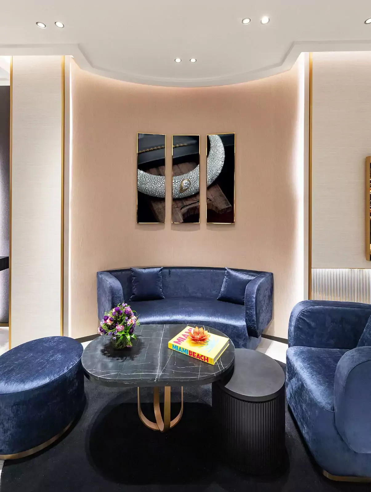 Sur 68 mètres carrés, la boutique conjugue chic parisien et modernité avec une façade en marbre agrémentée de détails dorés, un papier peint texturé et un espace lounge raffiné. Ce décor sophistiqué crée une atmosphère chaleureuse et élégante, signature du style Messika.