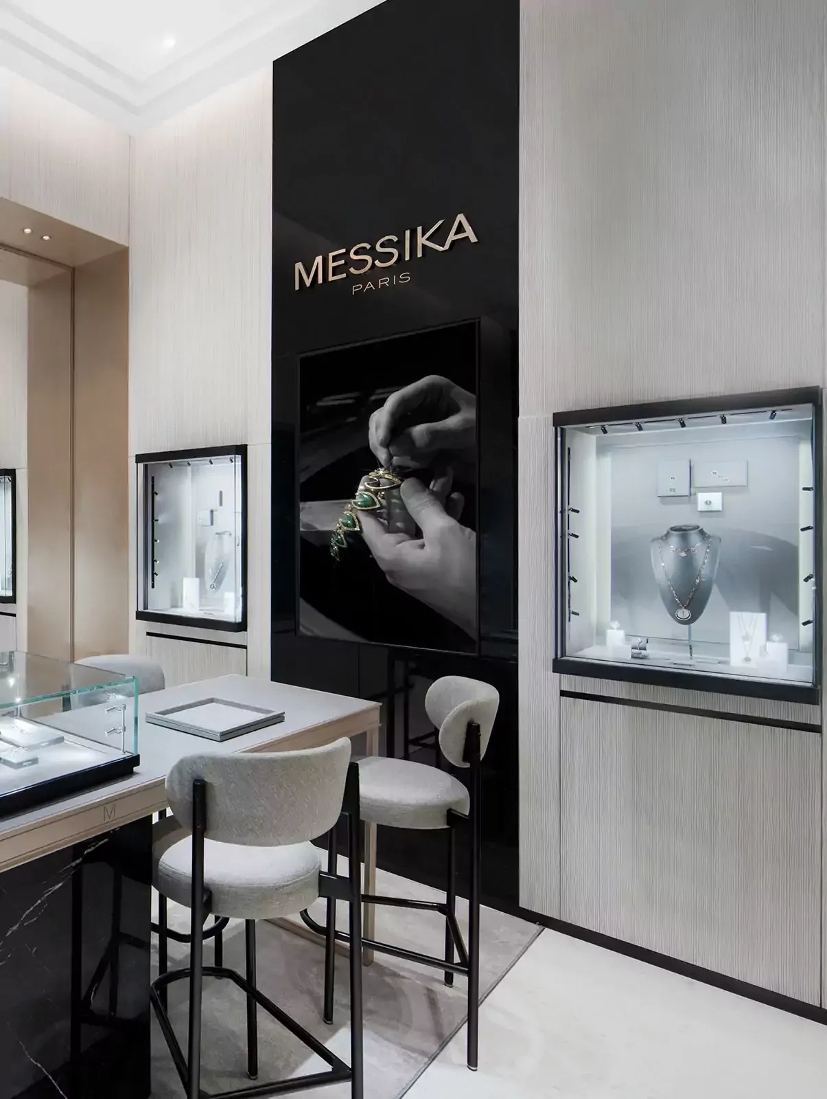 La boutique de 40 mètres carrés, dotée d'un espace VIP exclusif, est une invitation à découvrir toutes les collections de joaillerie iconiques de la Maison. Messika a également l'honneur de présenter une édition exclusive de la collection de Joaillerie Move Uno aux Emirats Arabes Unis. Dès son entrée, le client est immédiatement plongé dans l’univers de la Maison : détails de design symétriques, fenêtres transparentes, marbre noir pour mettre en valeur l’éclat des diamants.