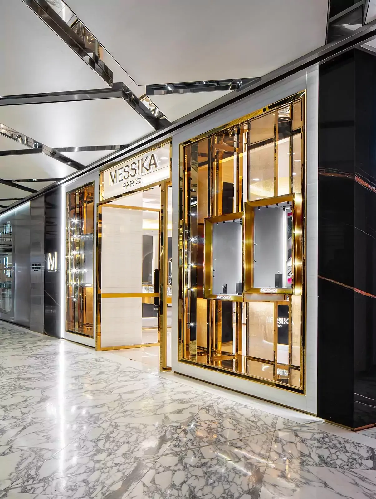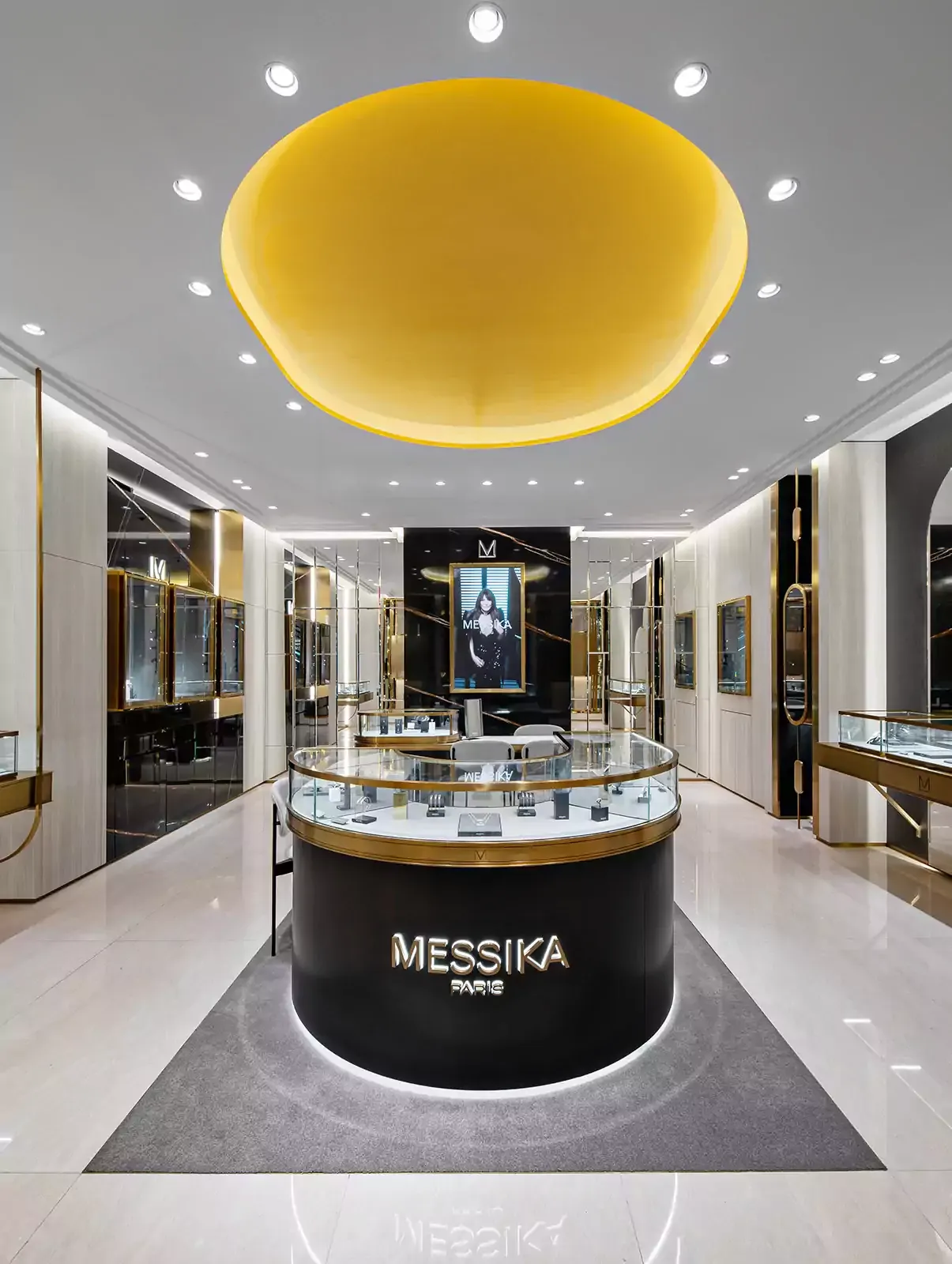 Tous les codes de la Maison sont à retrouver au sein d’un précieux espace de 65m2. Une pause luxueuse entre or et diamants pour apprécier l’éclat des bijoux de luxe Messika. L’expérience est sublimée par une architecture moderne et chaleureuse aux nuances dorées et noires, rehaussées par du marbre noir et blanc. Les accents art déco chers à Valérie Messika font du lieu un véritable écrin d’exception, respirant l’art de vivre à la française.