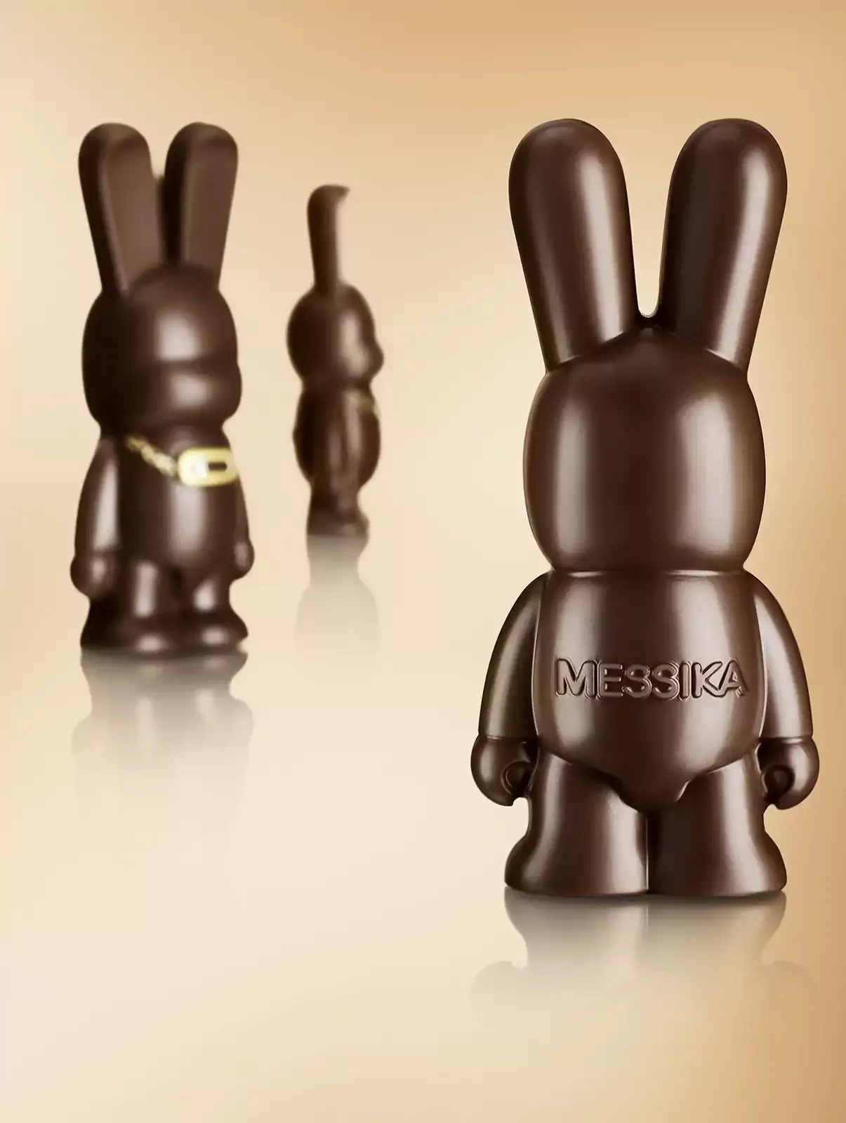 Pour cette collaboration, Christelle Brua et Valérie Messika ont eu envie de réaliser une création tout en chocolat, alliant l’univers des deux maisons. Ainsi, Lucien, le lapin espiègle, emblème de Madame Cacao se pare pour l’occasion du célèbre Move Messika. Ce délice d’exception tout en cacao, au design pop et street, souffle un vent de modernité pour les fêtes de Pâques. Un plaisir gourmand tout en chocolat au lait qui crée la surprise dans son coffret-écrin, aux sigles des deux maisons