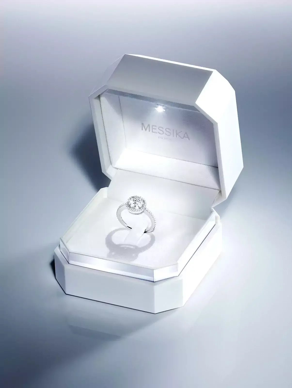 Au bout du chemin, une précieuse bague jalousement protégée dans un superbe écrin développé par Messika, vêtu de blanc et mâtiné d’or rose. Quand on l’ouvre, ô surprise, un faisceau caché vient éclairer le bijou, projetant le feu et l’éclat du diamant sous l’œil ébloui.
