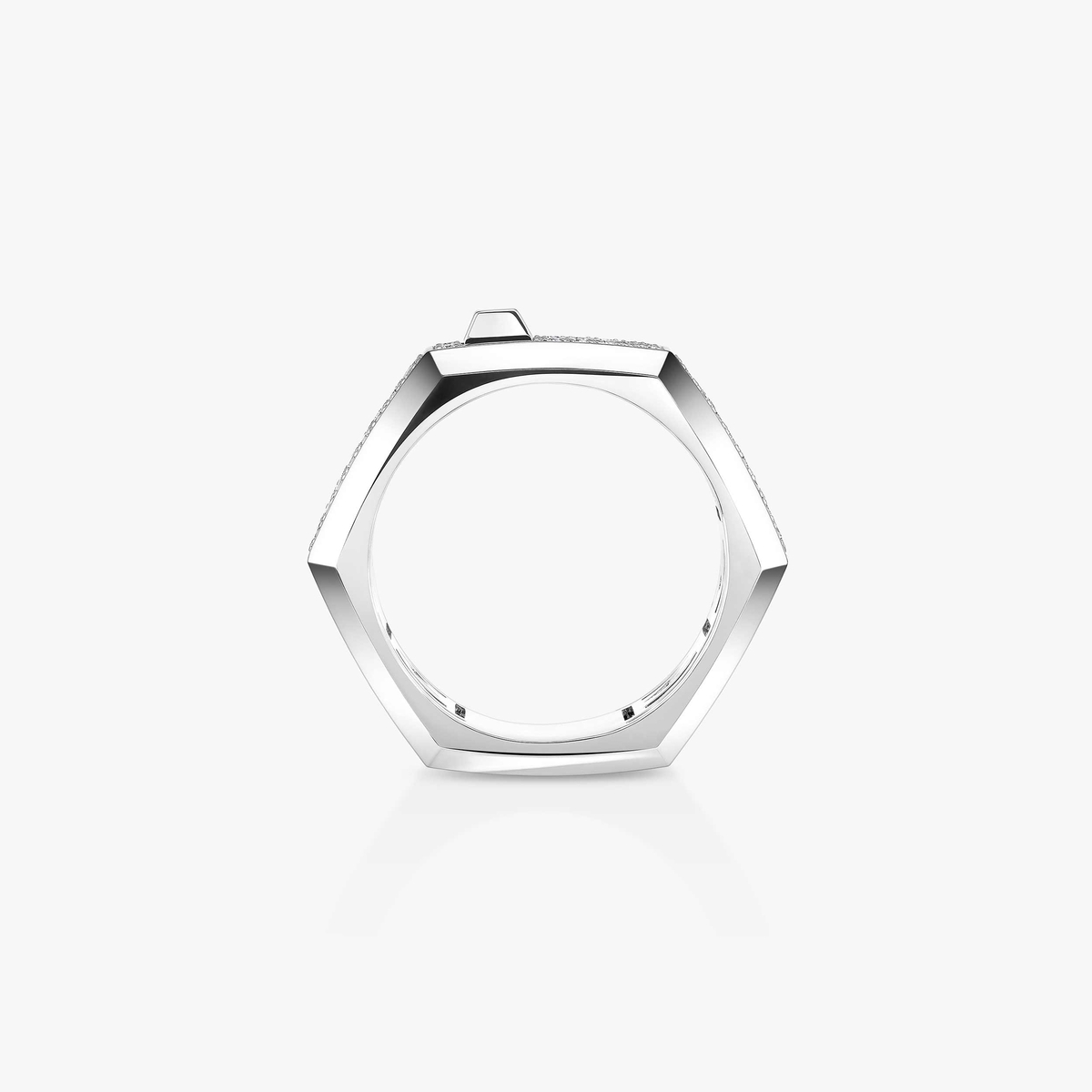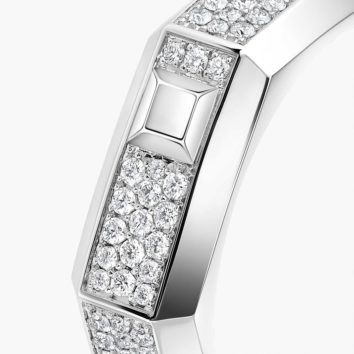 Valérie Messika traspone questo rigore formale nella materia, trasformando questo metallo solare in un’opera scolpita, sfaccettata come un diamante.