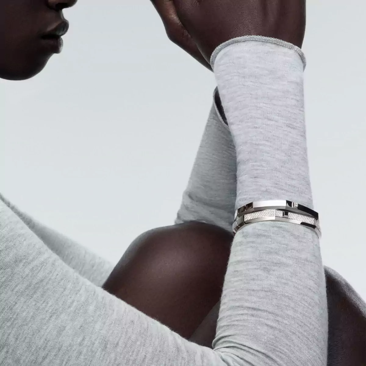 Valérie Messika traspone questo rigore formale nella materia, trasformando questo metallo solare in un’opera scolpita, sfaccettata come un diamante.