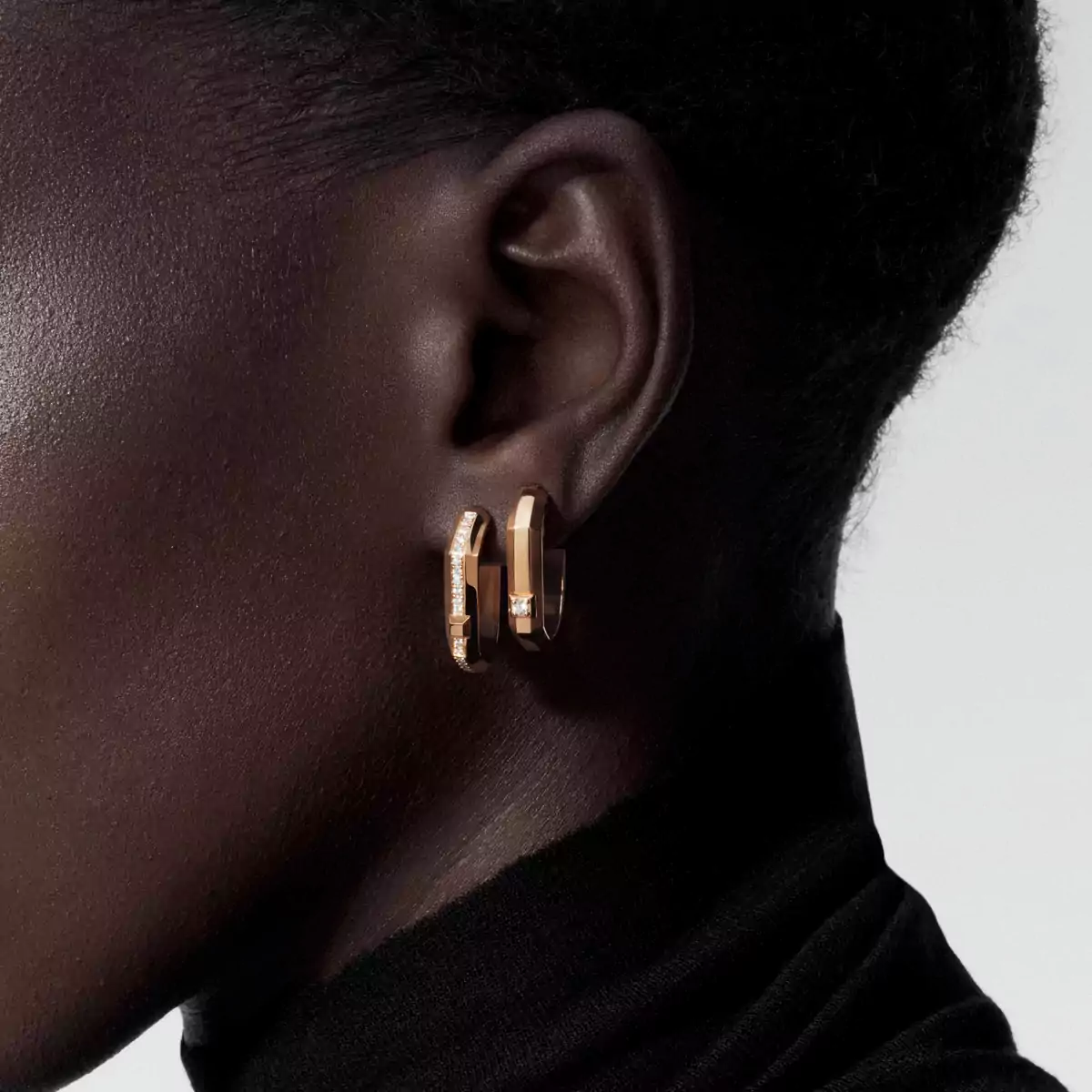 Valérie Messika traspone questo rigore formale nella materia, trasformando questo metallo solare in un’opera scolpita, sfaccettata come un diamante.