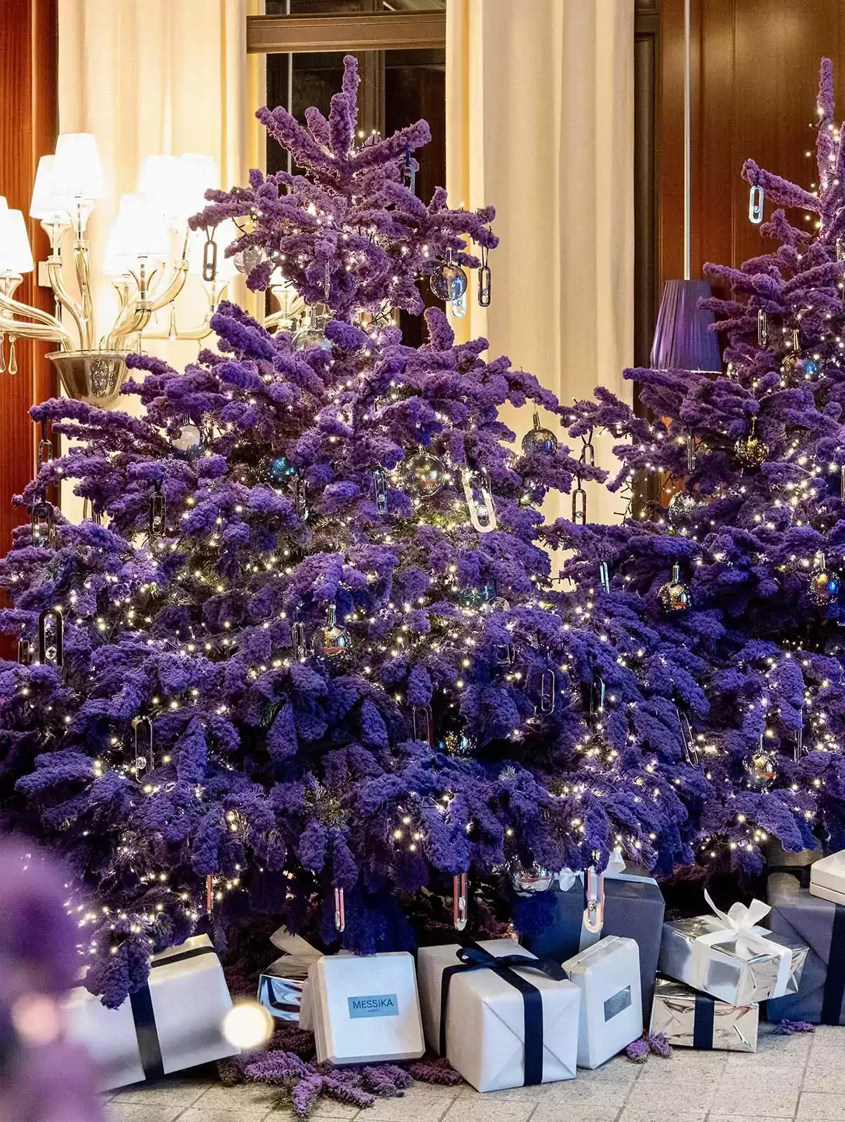 この機会に、パリの超高級ホテルはジュエラーの華やかなカラーできらびやかに彩られ、喜びにあふれる賑やかなひとときを分ち合う、シックでモダンな舞台が出現します。メゾンのシグネチャーカラーに染められたブルー&エレクトリックバイオレットのモミの木、XXLサイズのスノーフレーク、膨大な数のメシカ ギフトボックスが、グランドホテルの空間を明るく照らします。夢のようなデコレーションはアイコニックな《ムーヴ》モチーフからインスピレーションを得ています。空間がジュエリーに変身し、各装飾要素がモミの木とスノーフレークをきらめきで包み込み、華やかな光の星座が浮かび上がります。