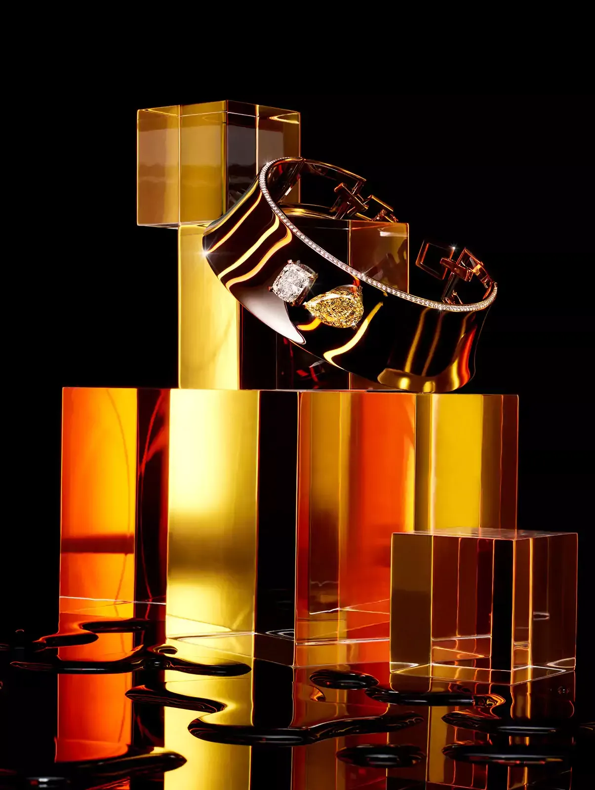 メシカが得意とすること、それはダイヤモンドの輝きを昇華させること。メゾンは、初めて伝統的な高級ジュエリーのスノーセッティングを駆使して、クッションカットを施した15個のイエローダイヤモンド(2~15カラット)を輝かせます。ダンスフロアのようにバラバラに敷き詰められたプレシャスな絨毯の上では、イエローダイヤモンドが主役です。《グリッター フィーバー》は、ヴァレリー・メシカのすべてのクリエーションと同様、きらめきのコントラストを演出しています。このジュエリーの幾何学的なシルエットは、厳密な構成を持たないダイヤモンドセッティングと官能的な曲線を描くクッションカットで完全に二分化されています。このフォルムと光の明暗法は、調和の取れたアンサンブルを生み出し、比類のない技術を物語っています。