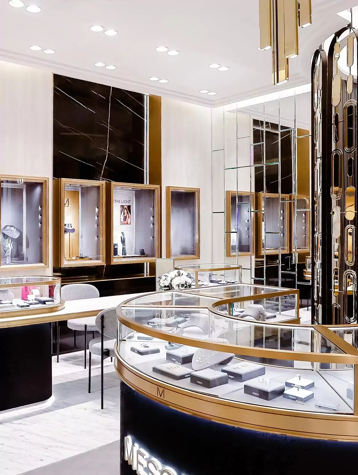 55m²の新しい店内は、ヴァレリー・メシカによってデザインされました。《ムーヴ》ジュエリーコレクションのクラシックな要素が取り入れられ、メシカのDNAを完璧に表現しています。シンメトリーなデザイン、透明な窓、あらゆる精巧なディテールが、ダイヤモンドジュエリーのまばゆいばかりの光を極限まで際立たせています。
