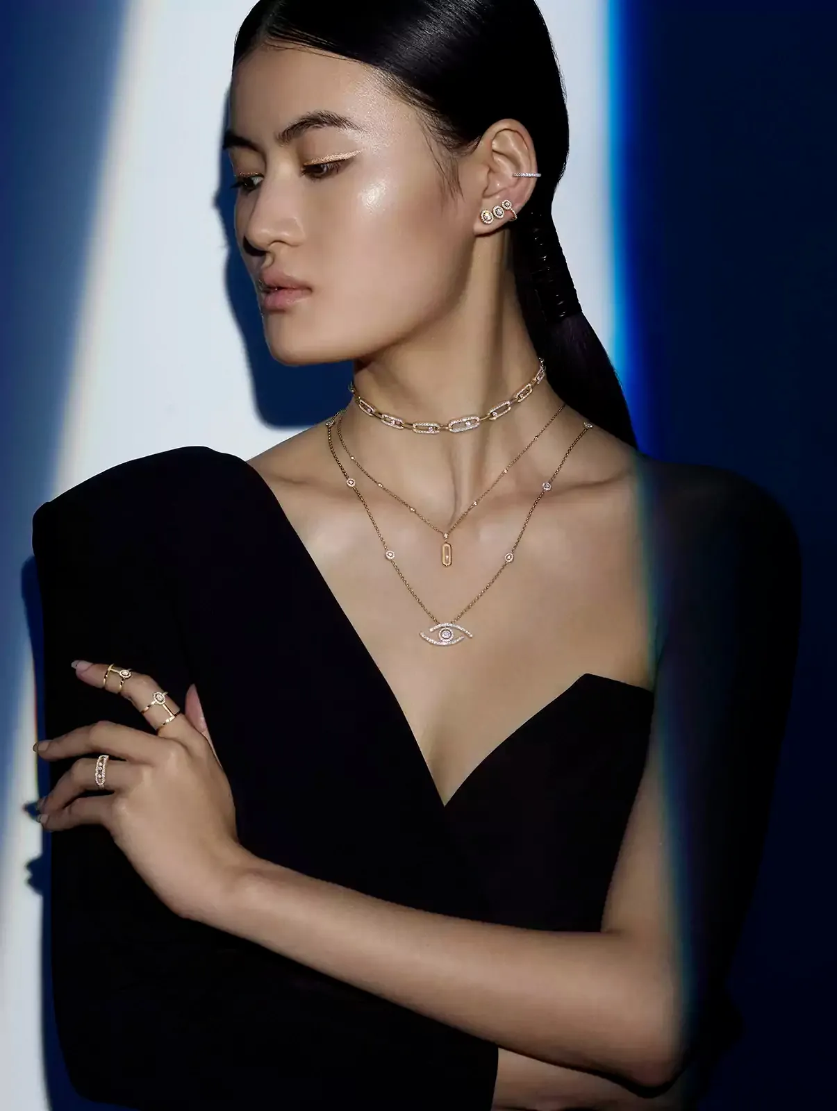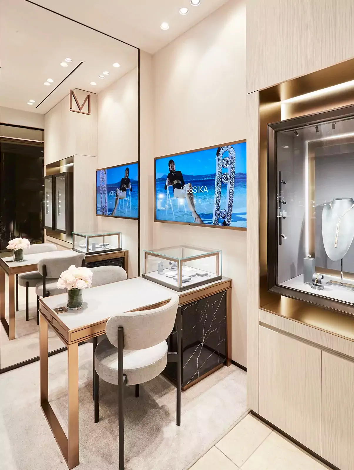 グレーとメタリック ピンク、大理石に面取り加工のミラーを配した、カラーと素材の独創的なコンビネーションが際立つ店内に、メシカのシグネチャー《ムーヴ》コレクションをはじめとするアイコニックなコレクションを揃えています。