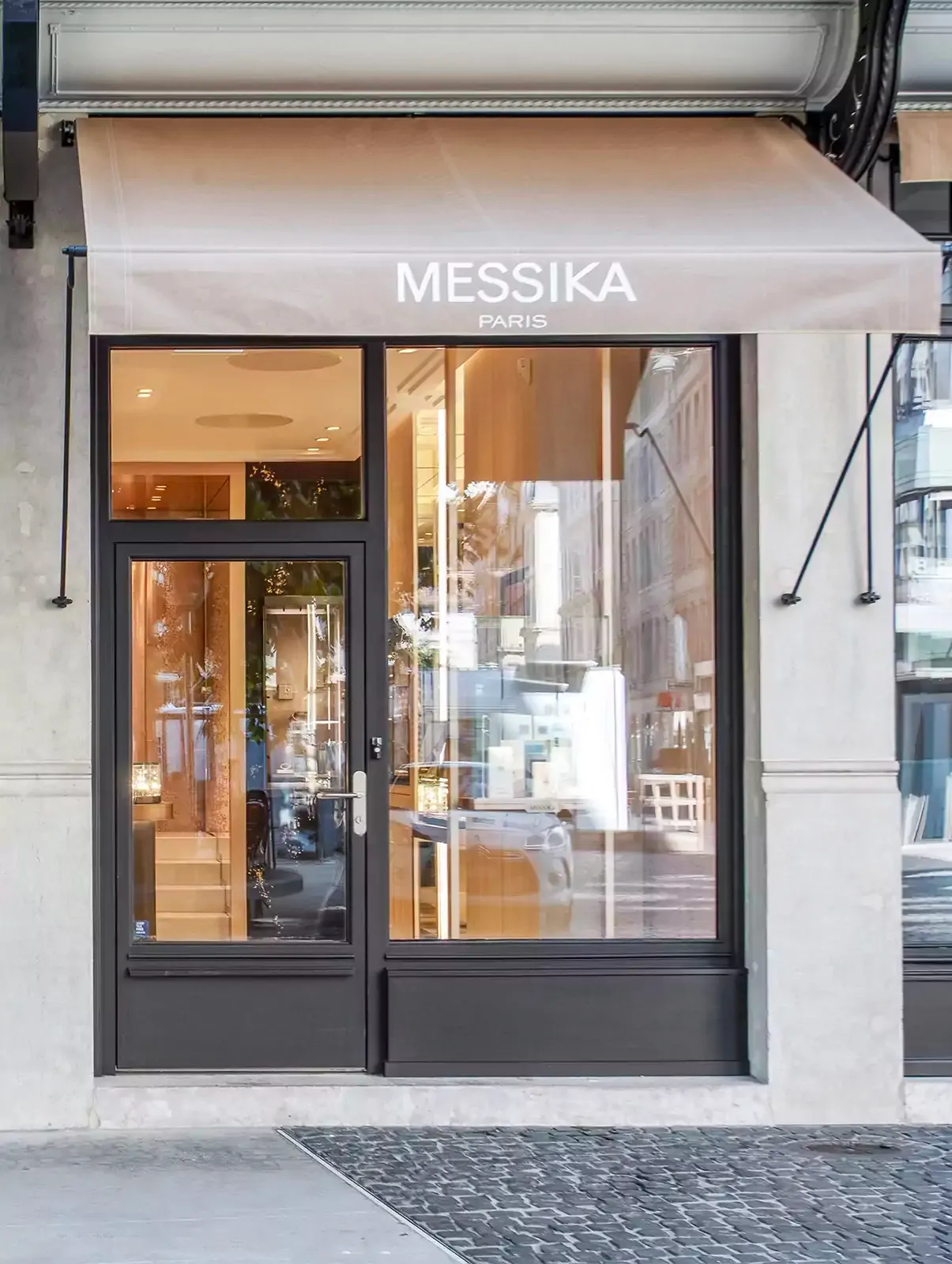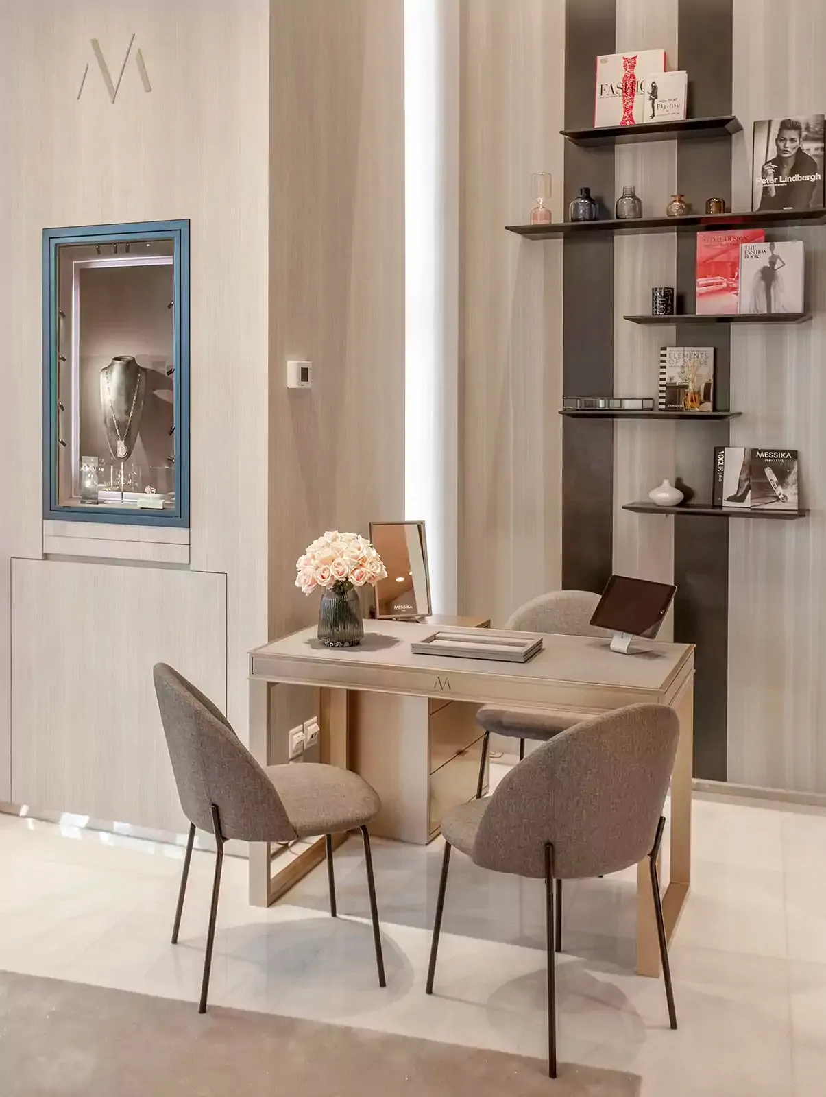 美しいロンジュマール ホテル内に構えられた53 m²のブティックは、メゾン メシカの創業者、ヴァレリー・メシカが内装のデザインを手掛けました。