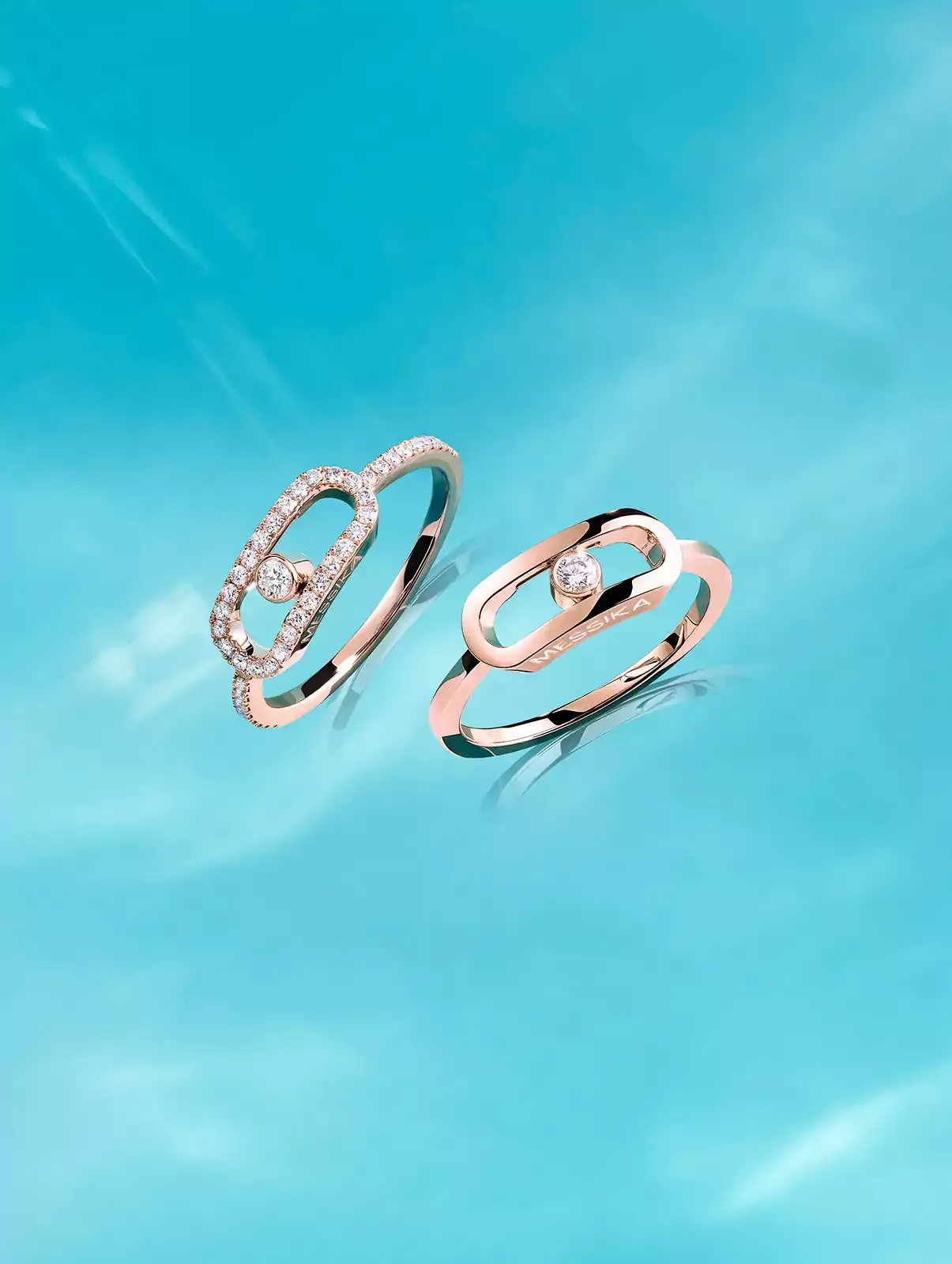 《ムーヴ》ダイヤモンド ジュエリーは、革新的で個性あるジュエリーを求めるすべての女性のためにデザインされています。どの女性も、メシカのさまざまな《ムーヴ》コレクションのなかに、自分に似たジュエリーや自分の個性に合ったジュエリーを見つけることができます。パヴェダイヤモンドモデルからノーマルのモデルまで、《ムーヴ》のラグジュアリー ジュエリーは、1つまたは3つのダイヤモンドがレールの中を自由にゆらめきます。それにより、落ち着きのある華々しさに導かれて、見る人をうっとりとさせる、彫刻のような佇まいを披露します。《ムーヴ》のジュエリーは、そのひとつひとつが世界で一番高貴なストーンに対して、また寄り添う女性に対して特別な思いを告げるもの。ダイヤモンドと喜びが一体となった唯一無二のダイヤモンドジュエリーです。