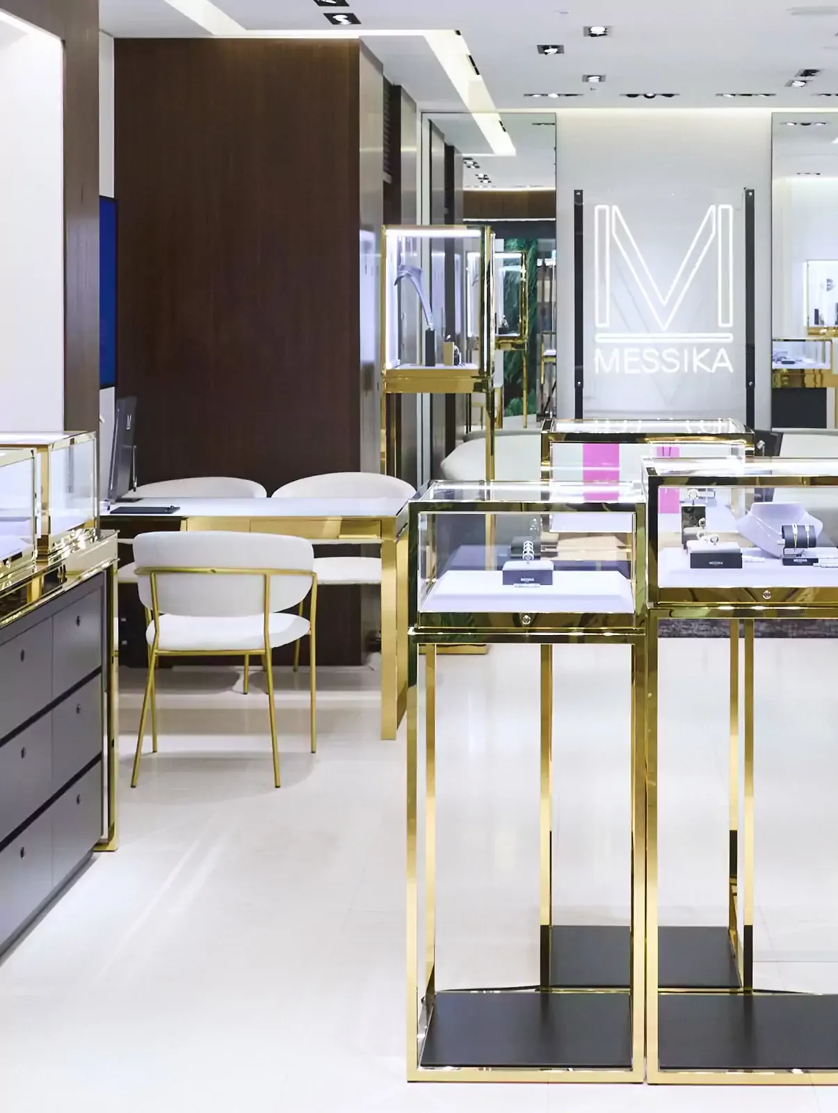 世界の名だたるラグジュアリーブランドと並ぶこの美しいブティックは、55m2の店内に高級感とモダニティが融合。明るく非構造的な雰囲気が漂います。ゴールドの色調はダイヤモンドの輝きを引き立て、お客様を瞬時にメシカの世界観へといざないます。